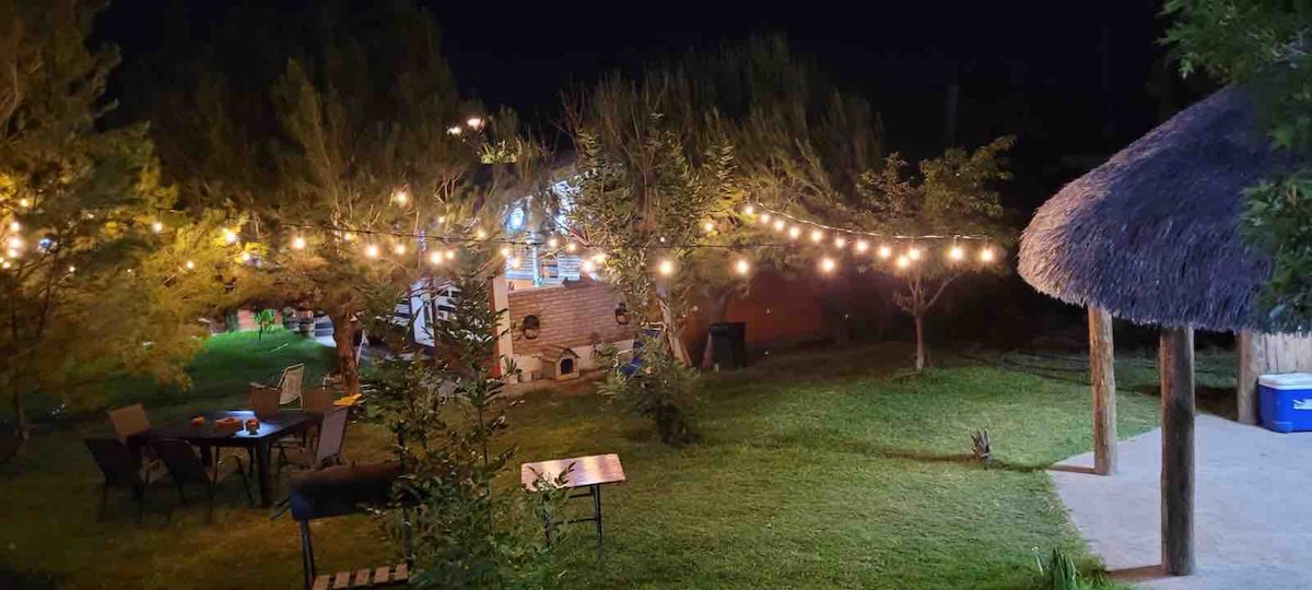 Área de jardín amplia y una palapa cómoda para disfrutar y descansar. Con asador y disfrutar de una convivencia. Cuenta con internet y pantalla 80 canales y servicios de streaming. Dos baños completos con sus amenidades shampoo, jabón; medio baño en el exterior. 4 camas individuales, 1 matrimonial y 1 sofá cama La sala tiene una agradable chimenea con la leña incluida para disfrutar de un momento inolvidable, fogatero en el exterior. Cocina completa, sala y comedor para, incluye juegos de mesa.