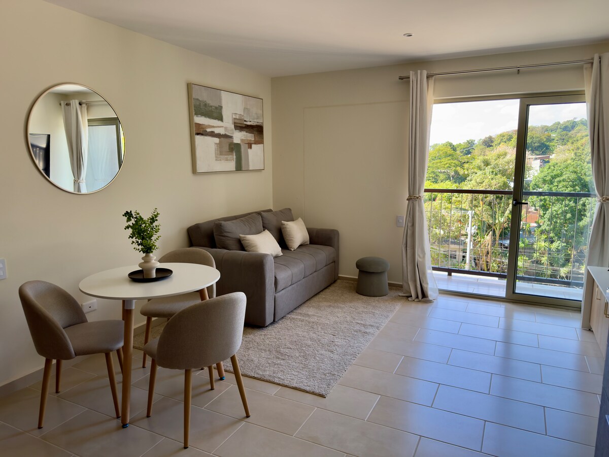 Hangulatos, tágas és modern lakás egy központi környéken. Gyönyörű kilátás nyílik innen a városra és a San Salvador vulkánra, mivel a 6. szinten található. Nagyon jól felszerelt, és mindennel fel van szerelve, amire szükséged lehet a kellemes időtöltéshez. Gyors wifi, tévé, meleg víz, légkondicionálás, konyha mindennel, amire szükséged van. Medence a tetőn. Tökéletes családoknak Nagyon jó elhelyezkedésű, kevesebb mint 5 percre a legnagyobb bevásárlóközpontoktól, éttermektől és bároktól. Biztonságos és exkluzív terület.