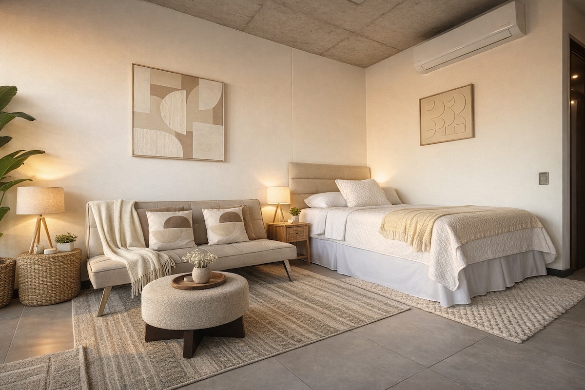 Modern otthonod Antiguo Cuscatlánban ✨ Szállj meg egy stílusos, 1 hálószobás lakásban a 11. emeleten, amely lélegzetelállító kilátást nyújt San Salvadorra. Tökéletes üzleti utakhoz, hosszú távú foglalásokhoz, vagy biztonságos és kényelmes kiindulópontként a város felfedezéséhez. A következőket tartalmazza: ✔️ King-size memóriahabos ágy, sötétítő függönyök, íróasztal és szék a távmunkához. ✔️ Modern nappali 65 hüvelykes okostévével, Alexával és kanapéággyal (1,70 m). ✔️ Teljesen felszerelt konyha ✔️ Privát erkély panorámakilátással ✔️ Parkolás és nagy sebességű Wi-Fi