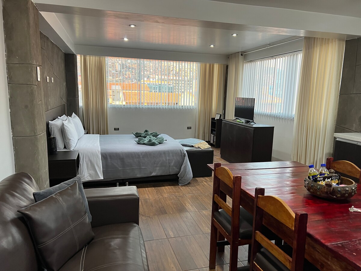 Moderno y confortable studio ubicado en una zona céntrica de Cusco, donde podrás encontrar muy cerca supermercados, restaurantes, farmacias, entidades bancarias y financieras, casas de cambio, clínicas de salud y otros, decoración moderna sencilla, funcional, acogedor y bien iluminado. Sala con Wifi, Netflix, Cable mágico, sofá confortables, kitchenette totalmente equipado, ducha con abundante agua caliente las 24 horas, terraza con sombrilla y vista panorámica de la ciudad.