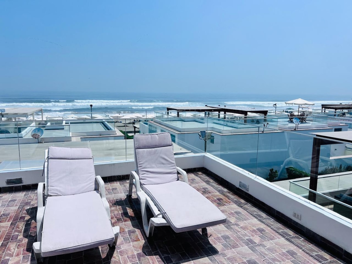 Közvetlen kilátás az óceánra a „Las Terrazas” társasház első emeletén található 180 négyzetméteres lakásomból, amely tökéletes azoknak a családoknak, szörfösöknek, távolról dolgozóknak és hosszú távú bérbeadásnak, akik békét és kikapcsolódást keresnek. A Cerro Azul szörfös helyének szívében található kényelmes és modern helyem WI-FI-KAPCSOLATOT kínál. Turisztikai látványosságok közelében: Cerro Azul surf point: 30 m Történelmi világítótorony: 400 m Juanito étterem: 100 m Restaurant Don Satu: 100 m Puerto Azul étterem: 800 m