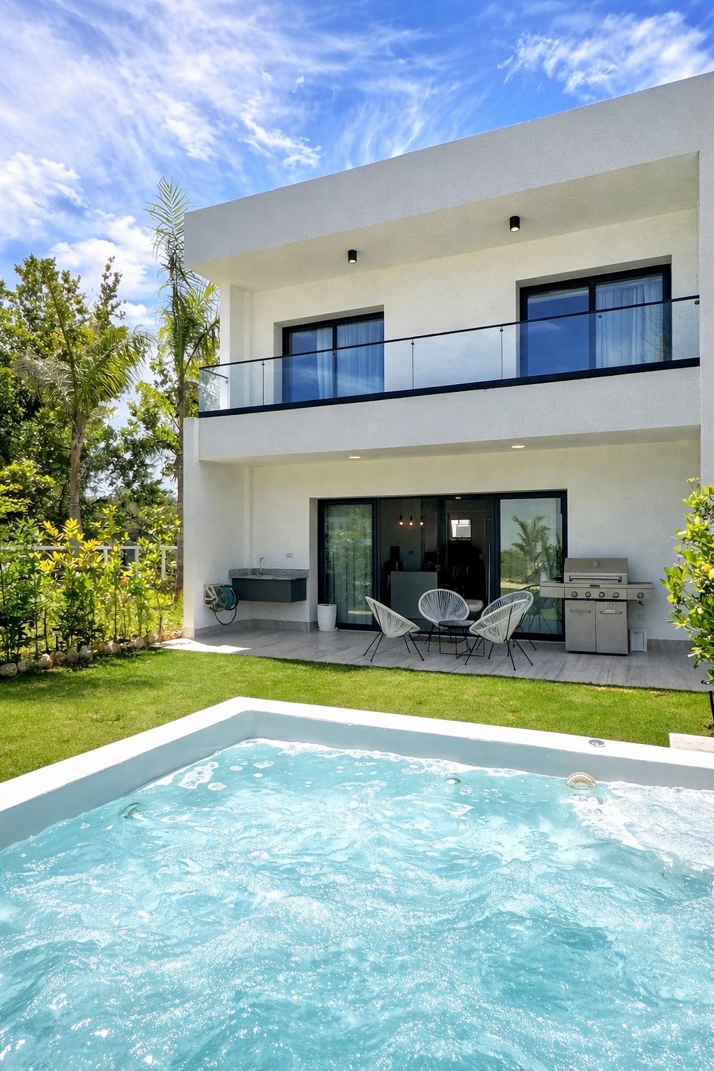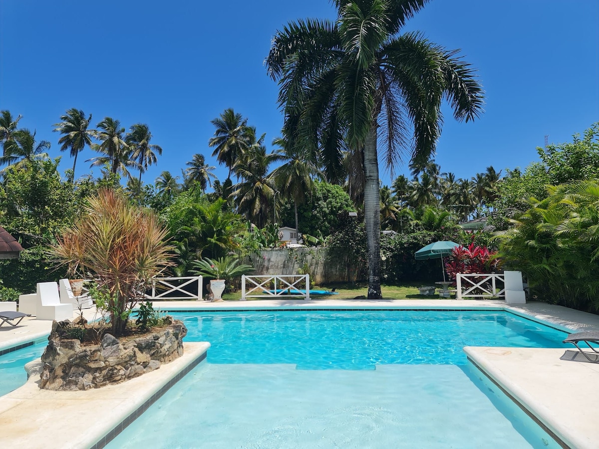 Ez a villa egy békés lakóhelyen található, amely akár 8 vendég elszállásolására is alkalmas. Rövid sétára a strandtól (200 m), a várostól (300 m), ahol üzletek, éttermek és szupermarketek találhatók. A villa újonnan épült, modern konyhával és fürdőszobával, trópusi kertekkel és saját medencével. Fiber nagysebességű internetkapcsolat. Reggel frissen vásárolhatsz halat a parton (5 perc séta), és éjszaka is beteheted a grillre. Emellett tipikus dominikai séf felár ellenében éstöbb kirándulásért is lehetséges.