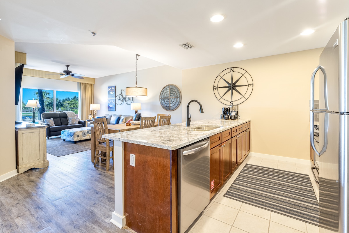 Sandestin Resort open-concept bright & wide single story duplex condo perfect for 4-6 adults and/or families...will sleep 8 w/sofa sleeper and 1 set of bunkies. Please note 2nd BR has 2 twin EXTRA LONG (80"/same as king) beds with private entrance to 2nd BA. Kitchen has granite and stainless steel appliances. Refrigerator has filtered water which tastes great. Golf cart seats 6 or fold down back seat to cart chairs to beach in provided tub. Condo located in secure area...tons of amenities.