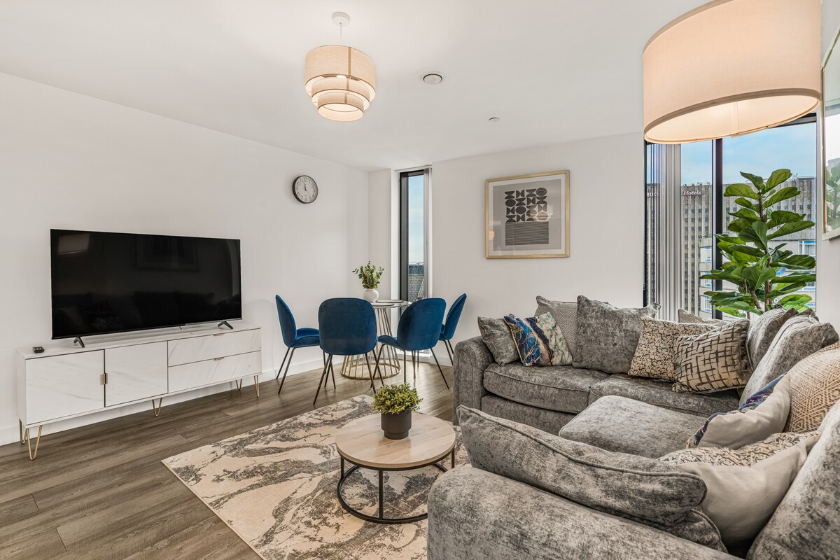 Üdvözöllek stílusos, 2 hálószobás, 2 fürdőszobás lakásunkban Birmingham szívében! A 8. emeleti lakás lenyűgöző kilátást nyújt a Broad Streetre, 4 főnek kényelmes ágyneművel, és csúcskategóriás felszereltséggel. Élvezd a szupergyors szélessávot, a Netflixet, a 2 okostévét és a teljesen felszerelt konyhát. Lépések a legjobb éttermektől, éjszakai élettől és látnivalóktól. Az épület kényelmi szolgáltatásai közé tartozik a lakók edzőterme, a társalgó és a biztonságos bejárat. Megjegyzés: Az engedély nélküli bulik 1000 font bírságot, valamint kártérítést és azonnali kilakoltatást vonnak maguk után.