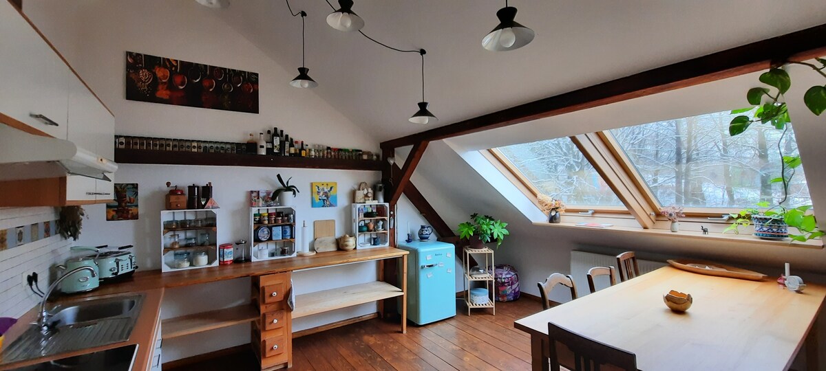 Vergiss deine Sorgen in dieser geräumigen, gemütlich eingerichteten Dachwohnung mit Blick auf Wald und Wiesen. Neben der komplett eingerichteten Küche gibt es ein Badezimmer mit Wanne, Waschmaschine und Gefriertruhe, ein großes Wohnzimmer mit Klavier, einen Fernseher mit Blueray und eine Bücherecke. Desweiteren gibt es ein Arbeitszimmer (PC) mit kleinem Yogabereich und ein Wäschezimmer. Insgesamt finden 6 Menschen einen kuscheligen Schlafplatz. Es ist absolut ruhig und man kann sich gut erholen.
