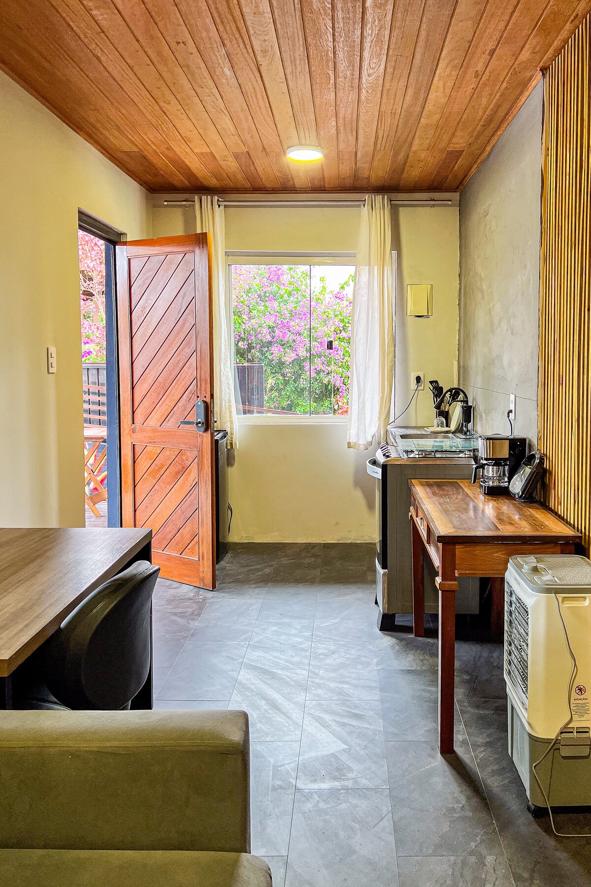 A Kit 2 acomoda 2 pessoas. E dispõe de cama de casal, ventilador de teto, Ar Condicionado (quente/frio), TV SMART, roupas de cama e banho. Cozinha completa com todos os utensílios, fogão, geladeira, liquidificador e cafeteira. Um banheiro com ducha elétrica secador de cabelo e itens básicos. Vaga de estacionamento para um carro. Wi-Fi. Varanda com vista para o patio e morro da Guarda. Ducha externa, tanque, patio/jardim compartilhados com outros hóspedes!