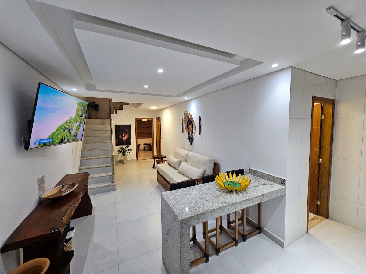 Temporary Duplex House 🏖️ Rental – 200m from Red Crown Muta Beach! Élvezd a felejthetetlen nyaralást egy új, otthonos és rendkívül teljes házban, amely mindössze 200 méterre található a Coroa Vermelha strandtól, a bahiai Santa Cruz Cabráliában! 🌊☀️ Ezt a duplex házat nagy szeretettel tervezték, hogy kényelmet, szabadidőt és biztonságot nyújtson neked és a családodnak! A házban 2 hálószoba és egy másik, párnak való galéria található.