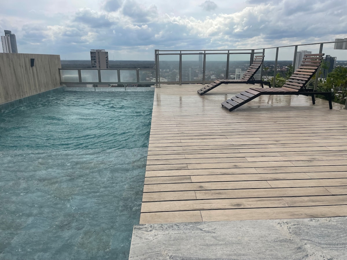 Élvezd a szálláshelyet Santa Cruz legmagasabban elhelyezkedő Airbnb-szálláshelyén és a város legjobb épületében. A létesítményekben medence, gőzszauna, valamint a 26. emeletről a gyönyörű Manzana 40 épületre, az ökológiai kordon természetére és az urubóra nyíló látványos kilátás vár rád. Néhány lépésre a szupermarket, éttermek, bevásárlóközpont, üzleti központ, bankok, gyógyfürdő. Santa Cruz legmagasabb és legszebb éttermei, a Cielo Skay Bar és a Jardin de Asia ugyanabban az épületben találhatók.