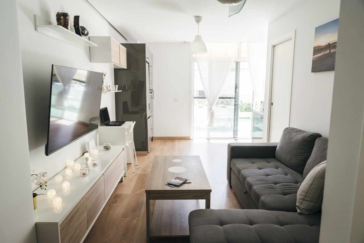 Hangulatos Apartamento en Tenerife, candelaria, las caletillas, ideális pároknak, ideális gyermekes családoknak és tökéletes távmunkához. A lakásban két tágas hálószoba, kanapéággyal ellátott nappali, fürdőszoba, teljesen felszerelt konyha, saját parkoló, két terasz található, az egyik nagyon tágas, 25 négyzetméteres, grillezővel, szoláriummal és pihenőhellyel, a másik terasz pedig elkerített, ideális távmunkára, olvasásra stb. Lakóépület két medencével