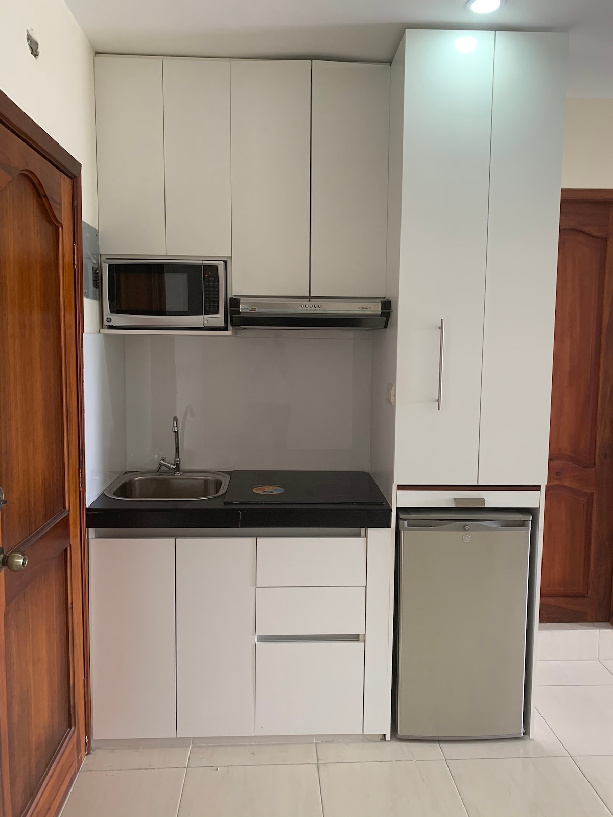 Habitación independiente, para dos personas, acabados modernos y minimalistas. Posee una pequeña cocina, refrigerador pequeño, cocina eléctrica, vajilla, pequeña mesa de comedor en un diseño integrado al meson de cocina. Nuestro edificio está frente al mar. No tiene vista al mar. Excelente ubicación en el alma turística de Salinas restaurantes, museos, entre otras atracciones para descansar y disfrutar. -Tiene parqueo exterior lateral al edificio. -La limpieza: toallas, sabanas y vajilla