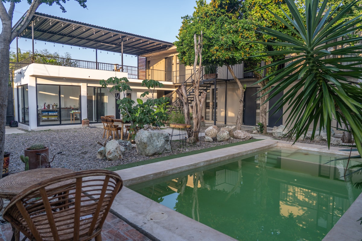 Házunk egy kényelmes és tágas hely, amely 5 perces sétára található Oaxaca főterétől és két háztömbnyire az Ethnobotanikus kerttől és a belvárostól. Itt gyönyörű pillanatokat oszthatsz meg ebben a szálláshelyben meleg színekkel és apró részletekkel, amelyek segítségével otthon érezheted magad. Az üzletek, kávézók és éttermek csak pár lépésre vannak. Emellett a város legbiztonságosabb területén található.