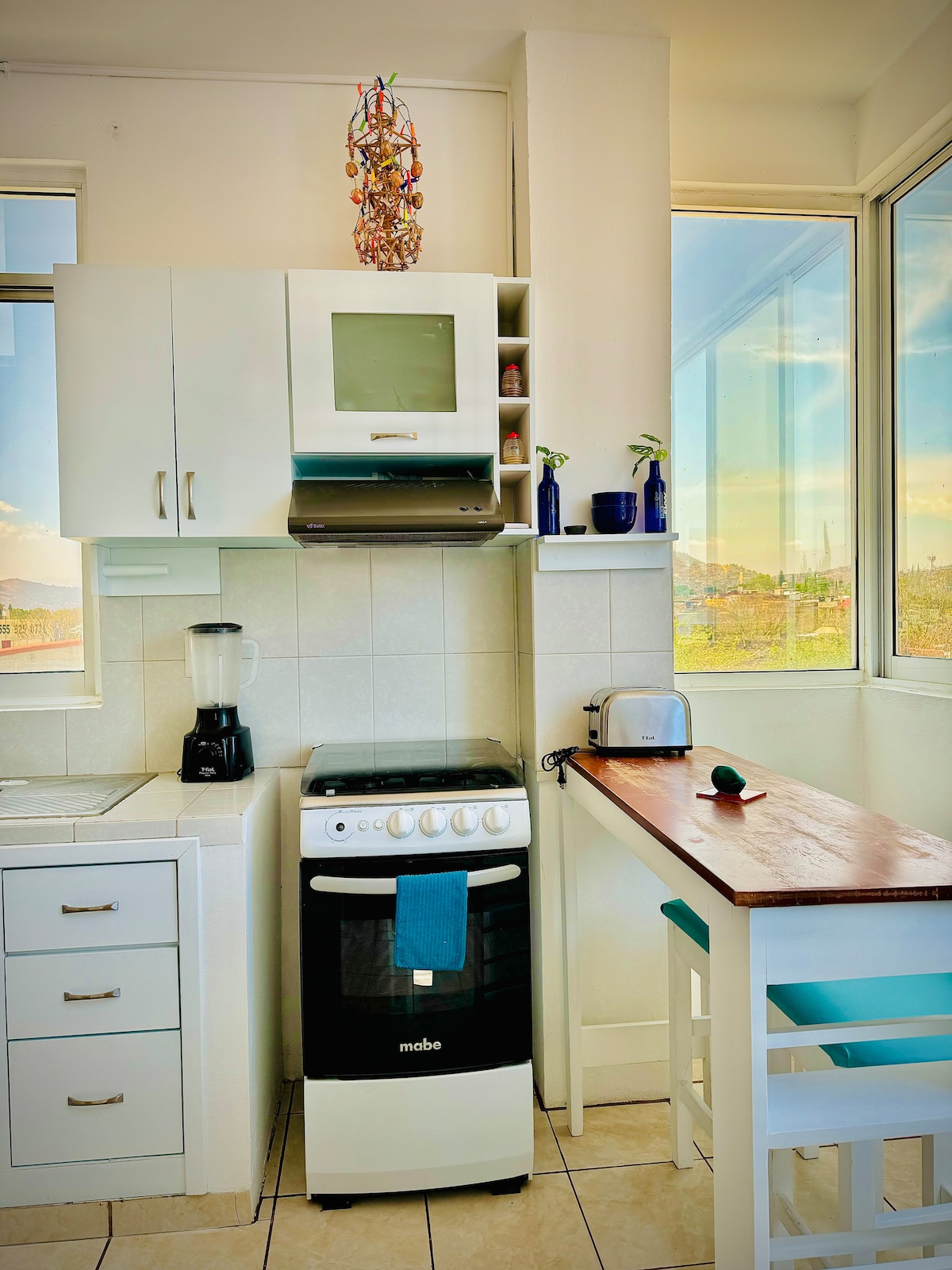 Kényeztesd magad a gyönyörű JUANA NEVŰ privát loftlakásban, amely 62 m2 alapterületű butiklakáskomplexumunkban. A családok szem előtt tartásával kialakított étkező és konyha a bejáratnál, egy félemeletes hálószoba íróasztallal és kanapéval, valamint egy alacsonyabb szintű hálószoba fürdőszobával és nappalival. Élvezd a két 43 hüvelykes 4K TV-képernyőt, a Wi-Fi-t és a központi elhelyezkedés kényelmét Oaxaca gyönyörű városközpontjában. A zocalótól és más látnivalóktól sétatávolságra található JUANA felejthetetlen tartózkodást biztosít.
