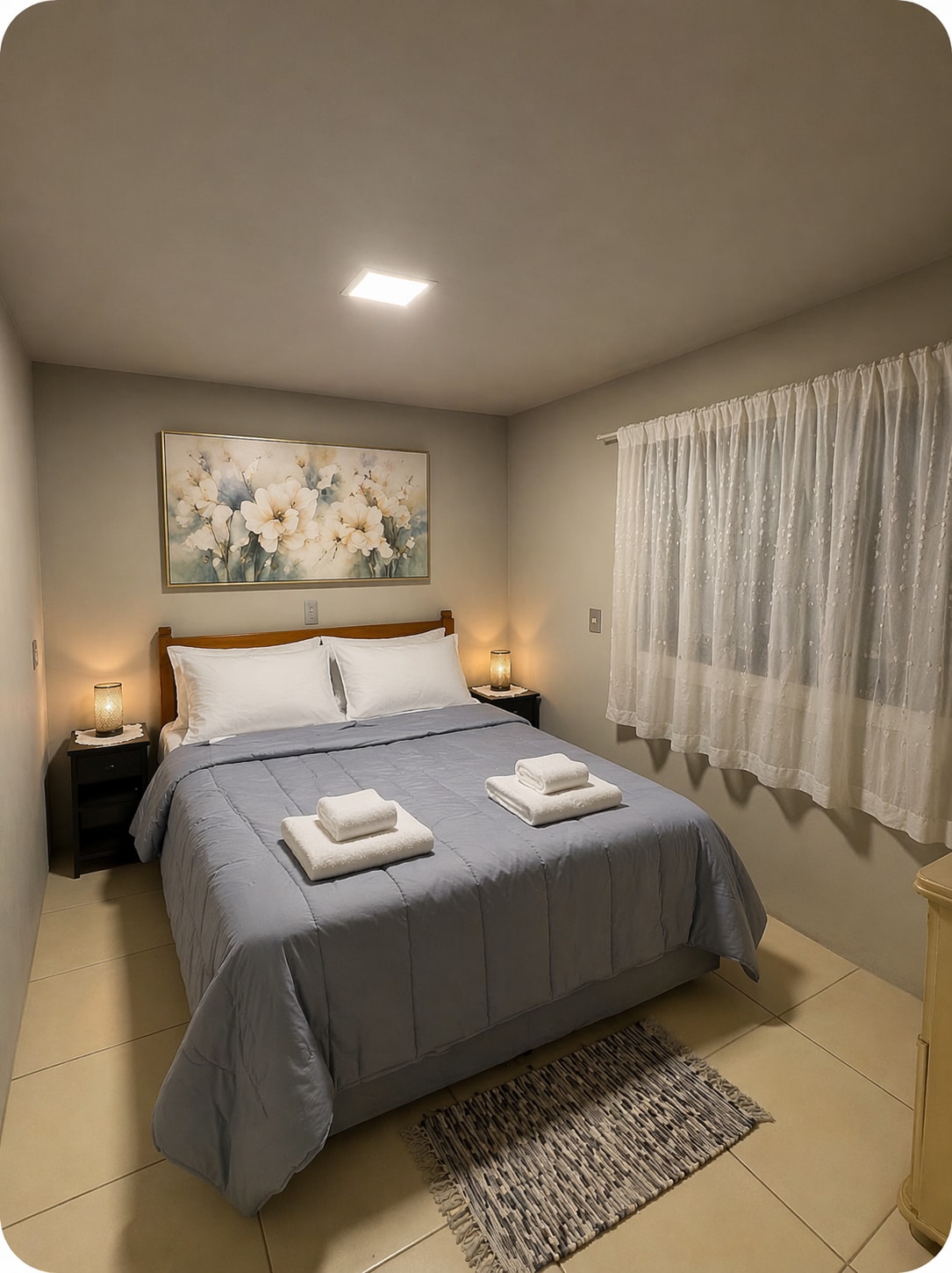 ÉJJEL-NAPPALI ÉRKEZÉS és TÁVOZÁS LEHETŐSÉGE - 2 hálószoba (1 lakosztály Smart 42’’ TV-vel) – Meleg és hideg légkondicionálás minden környezetben - Grillező – Teljesen felszerelt konyha (AirFryerrel) - Lávaruhák - Nappali kandallóval és intelligens TV-vel 42’’ - Étkezőasztal 4 székkel – Ágynemű, törölközők és takarók - Ampla fedett hely 1 autó számára (díjmentes) - Snowland, Aquamotion, Vila da Mônica, Lumni Experience és borászatok közelében - 10 perc autóval Gramado belvárosáig (7 km)