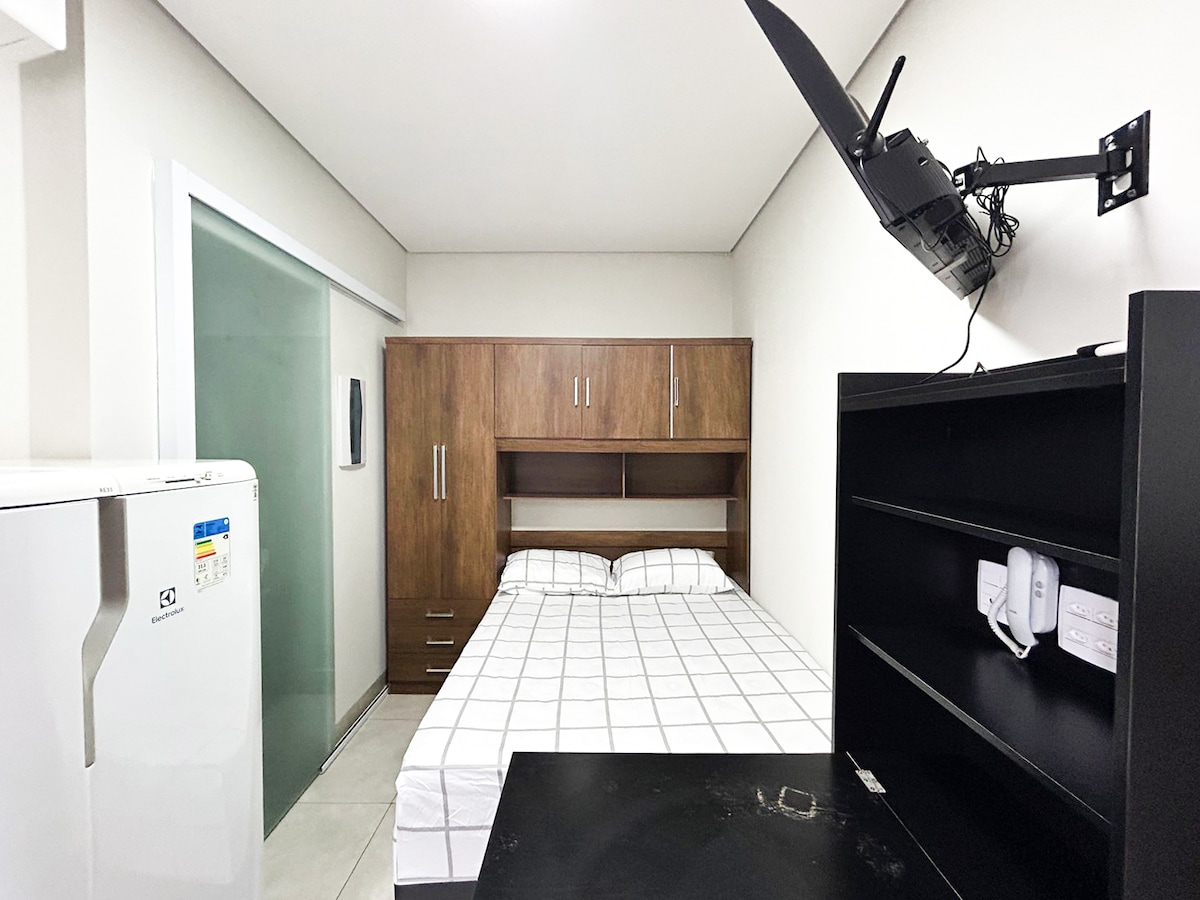 Kitnet located at Residencial Anna Júlia, condominium consists of 12 kitnets next to Prudenshopping (condominium 500m); A Kitnet két belső szobával rendelkezik: franciaággyal, 32 hüvelykes okostévével, légkondicionálóval és teljes konyhával, valamint teljesen felszerelt fürdőszobával. Külső szolgáltatási terület; Unit 05, located on the ground floor of the condominium, which facilitates for those who cannot climb stairs; Csendes hely, közel a piachoz, a gyógyszertárhoz és a bevásárlóközponthoz, ahol mindent megtalálsz