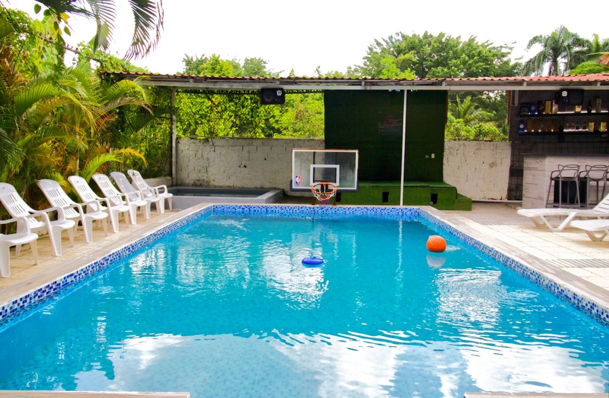 Menekülj el a saját elvonulós helyedre Santo Domingo Este-ben! Ez a luxusvilla vízeséses privát medencével, 12 fős pezsgőfürdővel, kosárlabdapályával, teljesen felszerelt konyhával, légkondicionált hálószobákkal és gyors Wi-Fi-vel rendelkezik, valamint egy íróasztallal a digitális nomádoknak és egy babaággyal a családoknak. Kényelmesen elfér 12 vendég.