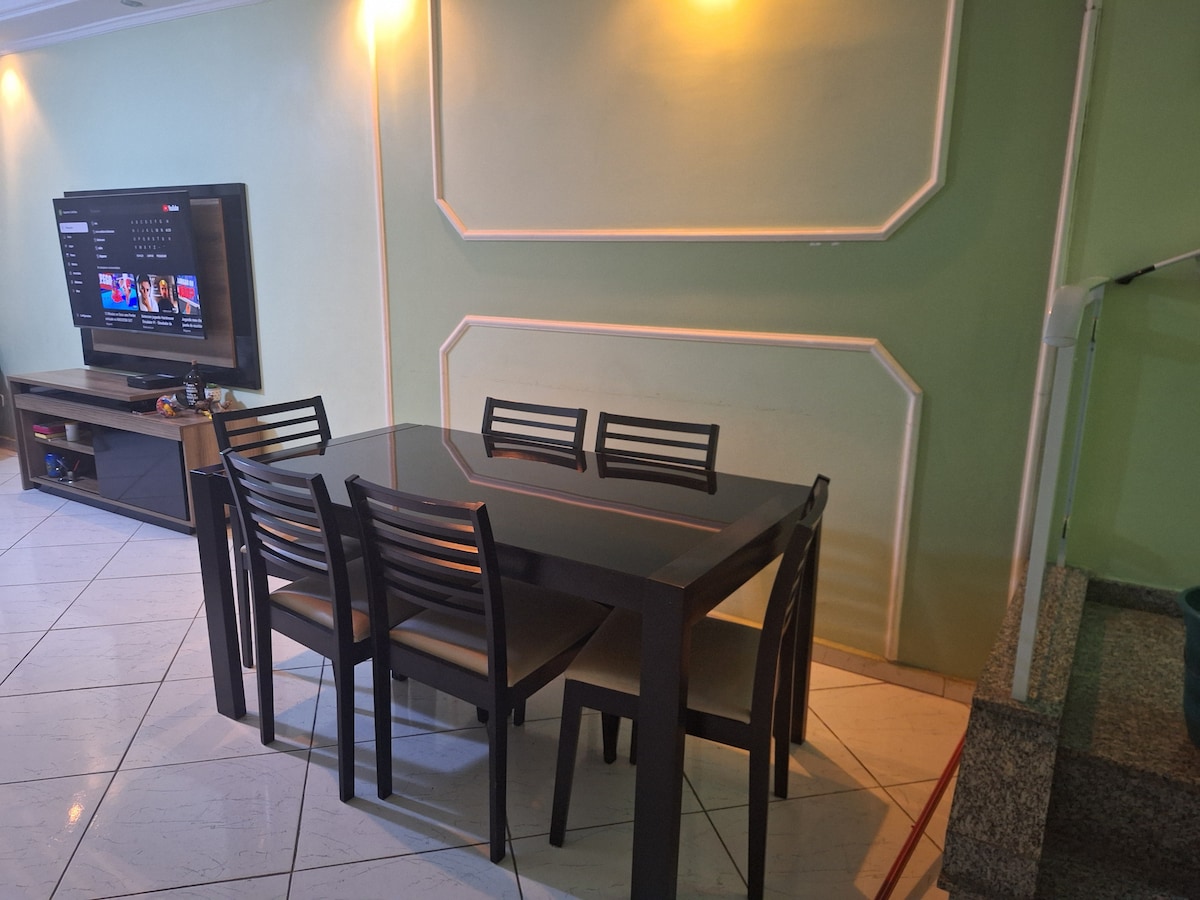 Sala de Refeições:(mesa,geladeira,microondas) - Sala de Estar:TV c/Chromecast, Wi-Fi, com 2 sofás camas, e 1 sofá comum. Quarto, c/1. cama box casal e 1 cama box solteirão, guarda-roupa, ventilador de teto. Banheiro grande, c/2 barras de ferro fixadas no box. Piscina grande,Hidro, churrasqueira, 01 banheiro externo, Sauna, Vestiário. Cozinha: na área externa da piscina, c/fogão, pia, geladeira e utens. cozinha Garagem