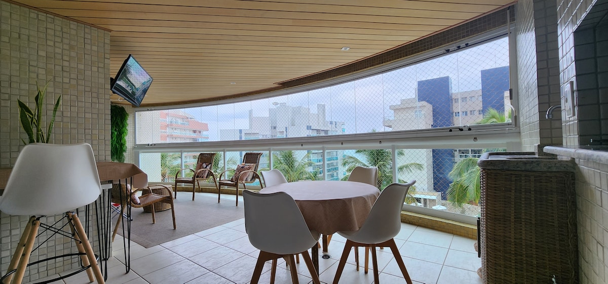 ** Datas abertas para o Natal, Férias de Janeiro e Carnaval. Pacotes com Desconto, valores melhores e condições especiais! Entre em contato.** Apto moderno e confortável com churrasqueira, varanda gourmet com Fechamento em Vidro e vista parcial para o mar. Situado ao lado da entrada da praia, no módulo 7, possui Serviço de Praia diário, Wi-Fi rápido, Piscina Aquecida, 1 suíte master com cama queen, e 1 quarto amplo com 4 camas de solteiro. O apto possui Ar Condicionado em todos os ambientes.