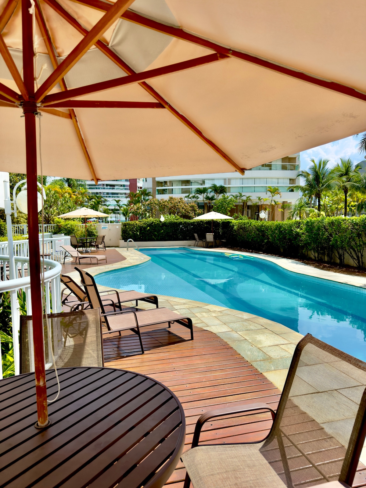 Modern és óceánra néző lakás a Riviera de Sao Lourenço hatodik moduljában, mindössze egy percre a strandtól. Fő hálószoba saját fürdőszobával. Két további standard hálószoba a közelben található standard fürdőszobával és kondicionálással minden hálószobában. Grillezőhely grillező az erkélyen. Teljesen felszerelt konyha, beleértve a Nespresso gépet is. Az épület közös területein található úszómedence és teniszpálya. Strandszerviz reggel 7-től délután 5-ig.