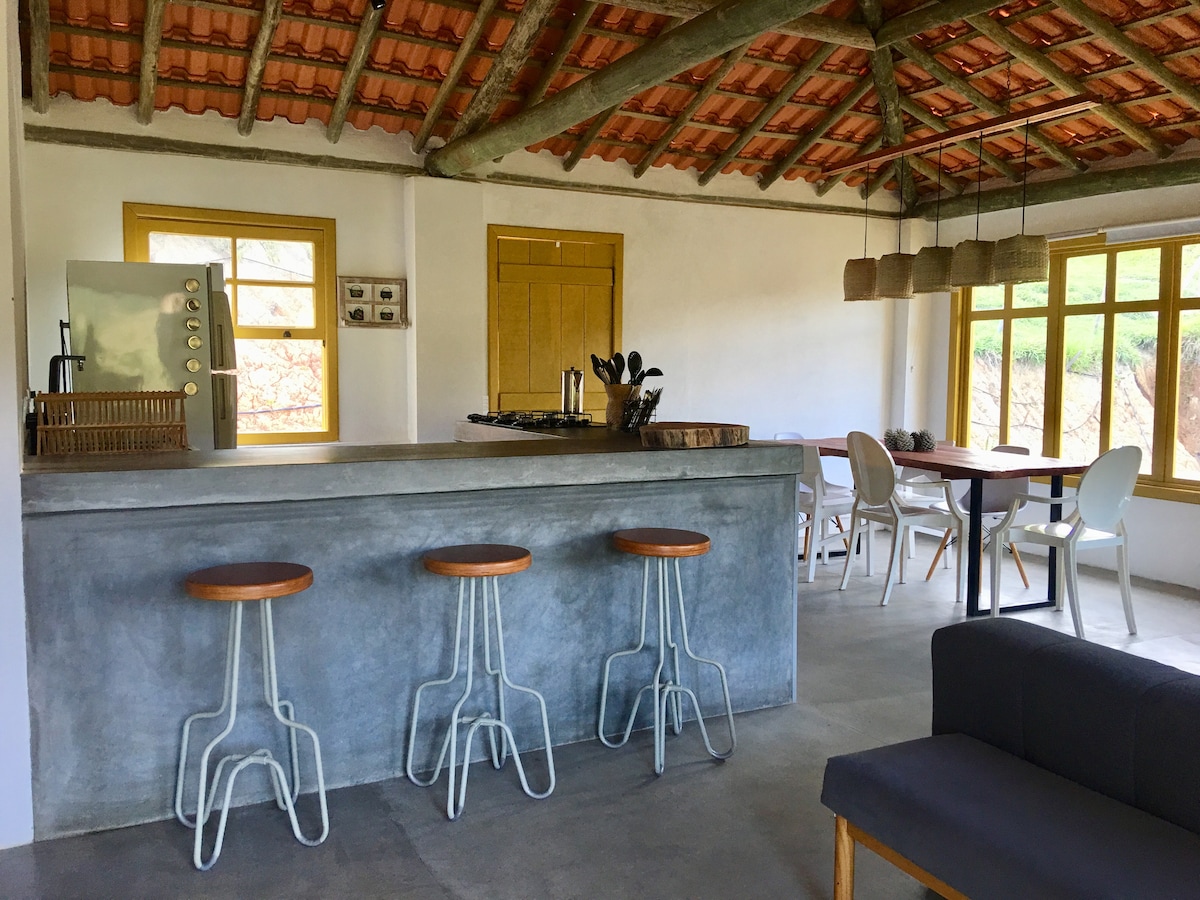 ‘Casinha’, assim chamada carinhosamente por nós. Casa de roça confortável sem perder a originalidade. Rodeada pela natureza com uma vista encantadora para um vale de montanhas e o som de um pequeno riacho ao fundo. Você pode aproveitar a lareira, fogão a lenha e uma charmosa varanda bem frequentada por beija-flores. O gramado que rodeia a casa é perfeito para tomar um solzinho, apreciar o céu estrelado, fazer almoços integrado a natureza ou simplesmente descansar nas espreguiçadeiras.