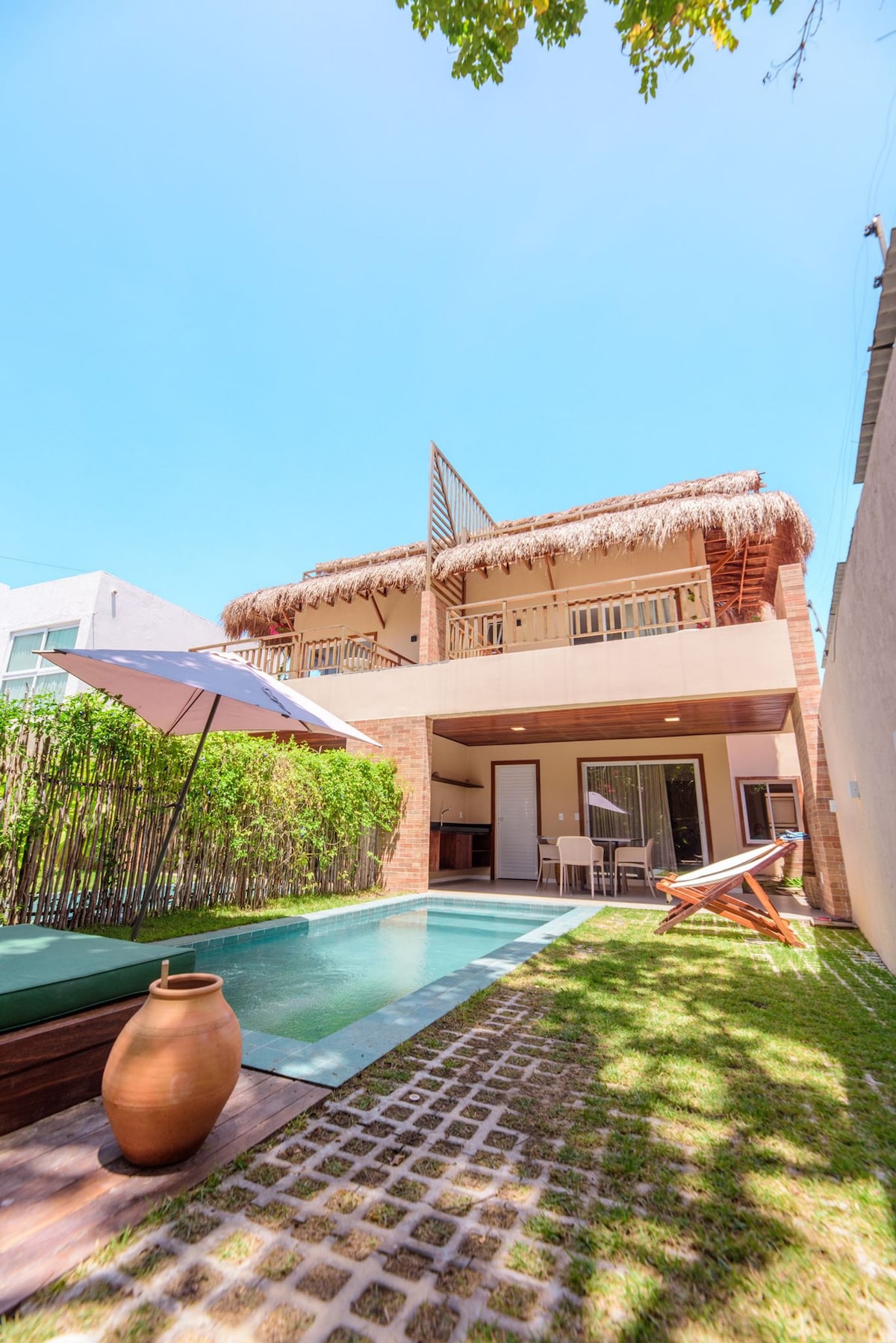 Casa Koral Milagres - New beach house with 3 bedrooms in closed condominium. Front row beach view and direct access to Praia Marceneiro. Private pool and garden. The house is located in Sao Miguel dos Milagres. The house faces the sea with unobstructed view/access to the beach. From the living room you can walk into the backyard with a pool and sand and sea in front of you - 3 bedrooms and 3 full bathrooms (2 being connected) - Queen bed in each bedroom and 4 pullout beds = Beds for 10 people