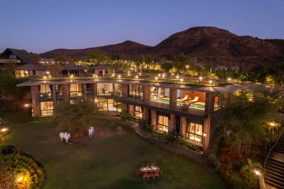🏡 Négy hálószobás villa a békés Anjaneri-hegységben, 25 percre Nashiktól és 2,5 órára Mumbaiból – 8–16+ vendégnek alkalmas, saját medencével és 4,5 fürdőszobával – Tágas nappali és társalgóhelyiségek hangulatos minibárral – Teljesen felszerelt konyha és elegáns beltéri étkezőhelyiség - Helyszíni séf áll rendelkezésre (felár ellenében) finom ételekhez vagy grillezéshez – Kisállatbarát szálláshely🐕🐶 Tökéletes családi kiruccanásokhoz, különleges alkalmakhoz vagy békés pihenéshez a Sula szőlőhegyek🍷 és a Trimbakeshwar templom🛕 közelében.