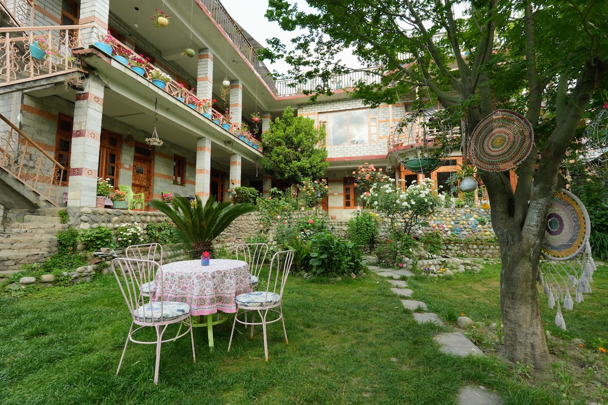 Egy ház a Himalája szívében, távol a város nyüzsgésétől. Élvezd a nyugodt kilátást a völgyre, amelyet szilva, alma, datolyaszilva és más fák vesznek körül. Békés hely, amely tökéletes egy pihentető nyaraláshoz vagy munkához. Ébredj fel a hegyekre nyíló csodálatos kilátásra, élvezd a pihentető napot, és olvass egy könyvet az erkélyen, vagy fedezd fel a számos közeli helyszínt és kalandtevékenységet. Ez a hely mindenki számára kínál valamit.