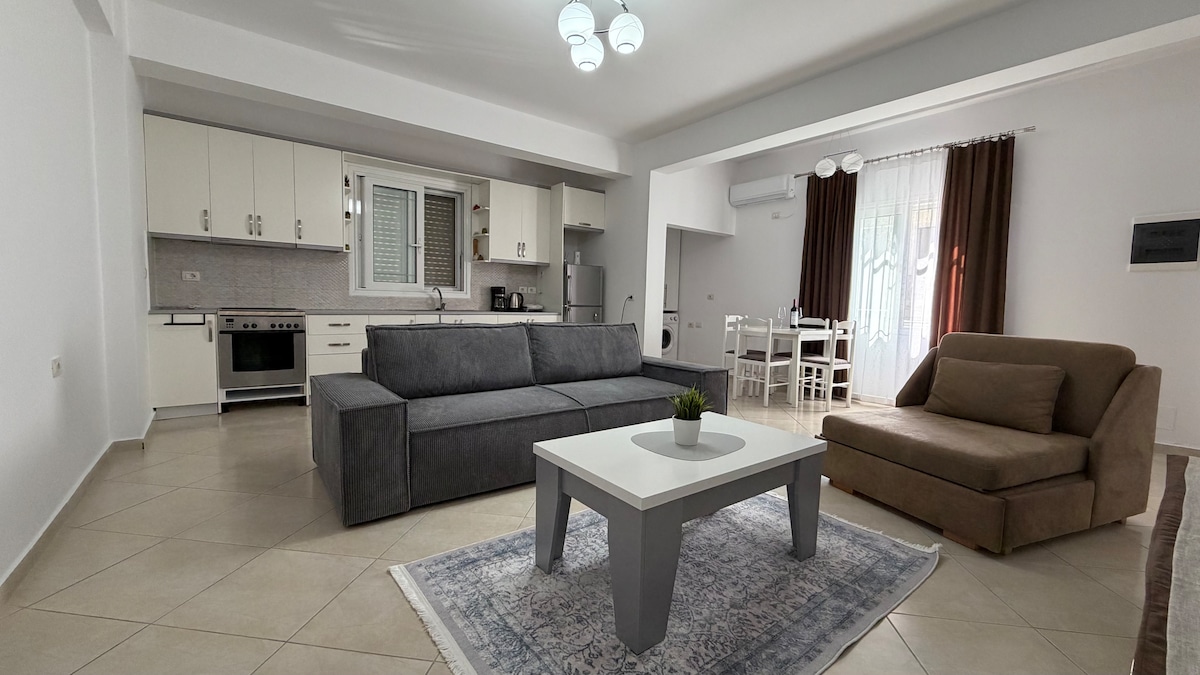 Spacious apartment! Very comfortable for 3 persons with big kitchen ,bathroom ,dining table,balcony and everything else that will make your stay special. The bedroom has double bed. The Livingroom is too big ,it has one Sofa Bed that can be streech out and to become anextra double bed. Spacious balcony shared with the host. We are located in Saranda center near of many shops,restaurant,supermarkets ,cafes and 3 min walk to the beach. The place is clean and very quite! You are welcome!