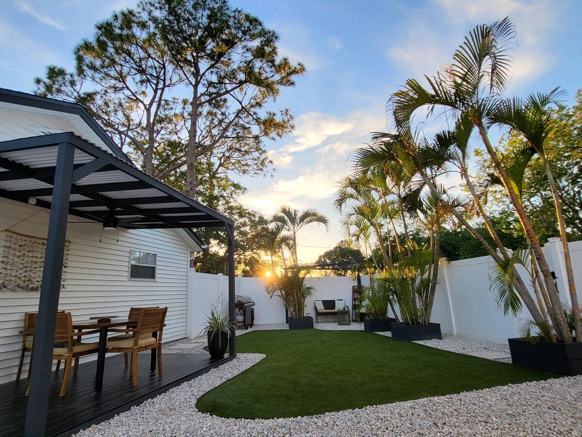 Éld át az életet 4 háztömbnyire az öböltől, fél mérföldre Siesta Key-től – Amerika első számú strandjától. Könnyedén elérhető Sarasota éttermei és művészeti helyszínei, a Siesta fehér homokos strandjai, a St. Armand's és a Gulf Coast kalandjai! 2 hálószobás butikbungaló • 6 fő • 4 ágy A hőn áhított tengerparti kerületben („West of Trail”) található – séfkonyha, strandfelszerelés, okostévék, márvány pezsgőfürdő, mosoda, gyors Wi-Fi. Grillezz homárt a csillagok alatt, lazíts a trópusi kertben, és sétálj a pálmafák között a kávézókig, és élvezd a naplementét a vízparton.