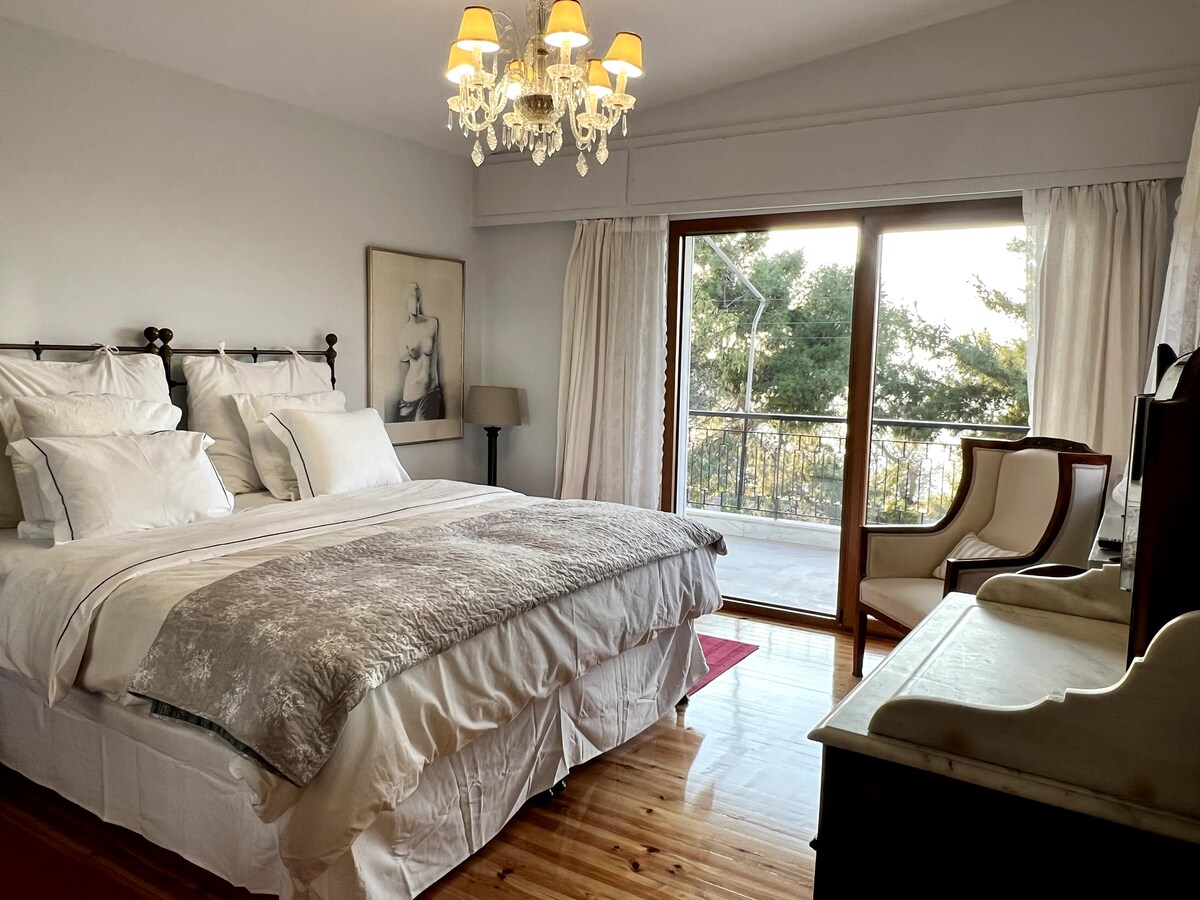 Igazán egyedi, királyi stílusú penthouse mindössze 8 percre az athéni repülőtértől. Mint egy privát múzeum, itt is megtalálható régiségek, túlméretezett 200×220 ágy, egy nagy privát terasz, valamint a tetőre nyíló kilátás és a repülőgépek megfigyelése. Ideális családok számára, rengeteg hellyel és karakterrel, amit sehol máshol nem találsz meg a környéken. Az üvegajtók természetes fénnyel árasztják el a helyiséget, és keretezik a nyitott eget — ez egy egyedi szálláshely, amely ötvözi a klasszikus bájt a ritka városra nyíló kilátással.