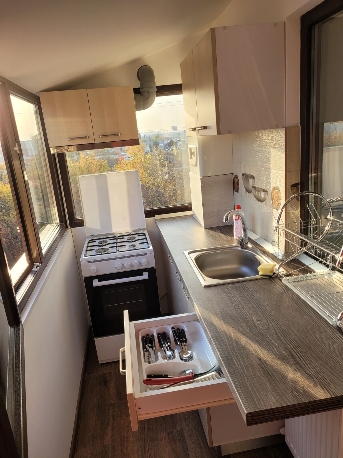 Enjoy a relaxing stay in a cosy artist’s house close to Otopeni Airport, Therme SPA and Baneasa Shopping City - +/- 20 mins driving. Perfectly located near a cosy restaurant (1 km), a supermarket (500m) and a lake (2 km). Private parking inside. Not recommended for small children. Living room with convertible sofa Bedroom with double bed (160x200) Kitchen equipped with fridge, induction cooker, oven, washing machine Modern Bathroom equipped with shower cabin, wc, sink Extras: Wi-Fi, TV, AC.