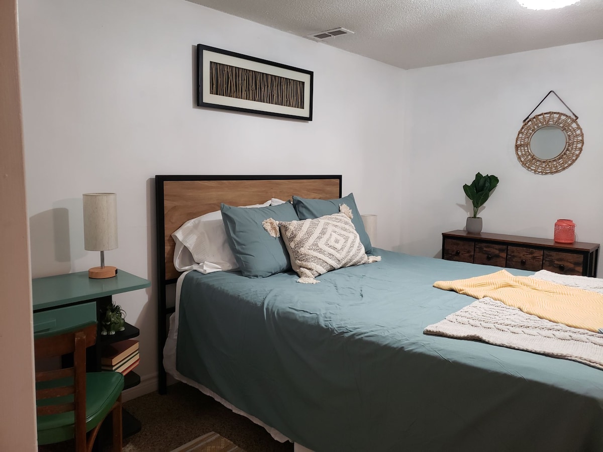 🇨🇦 Élvezd ezt a központi elhelyezkedésű, tiszta bohó apartmant saját bejárattal. Ez egy egy queen méretű ágyas lakás nyitott alaprajzzal. Teljesen felszerelt konyha, teljes fürdőszoba, reggeliző bár, íróasztal és étkező. Mindened meglesz, amire szükséged lehet a rövid vagy hosszú távú foglaláshoz. Ez egy ház alagsorában található. A házigazda az emeleten lakik a kutyájával. A lakás teljesen privát. A hátsó udvarhoz való hozzáférés közös.