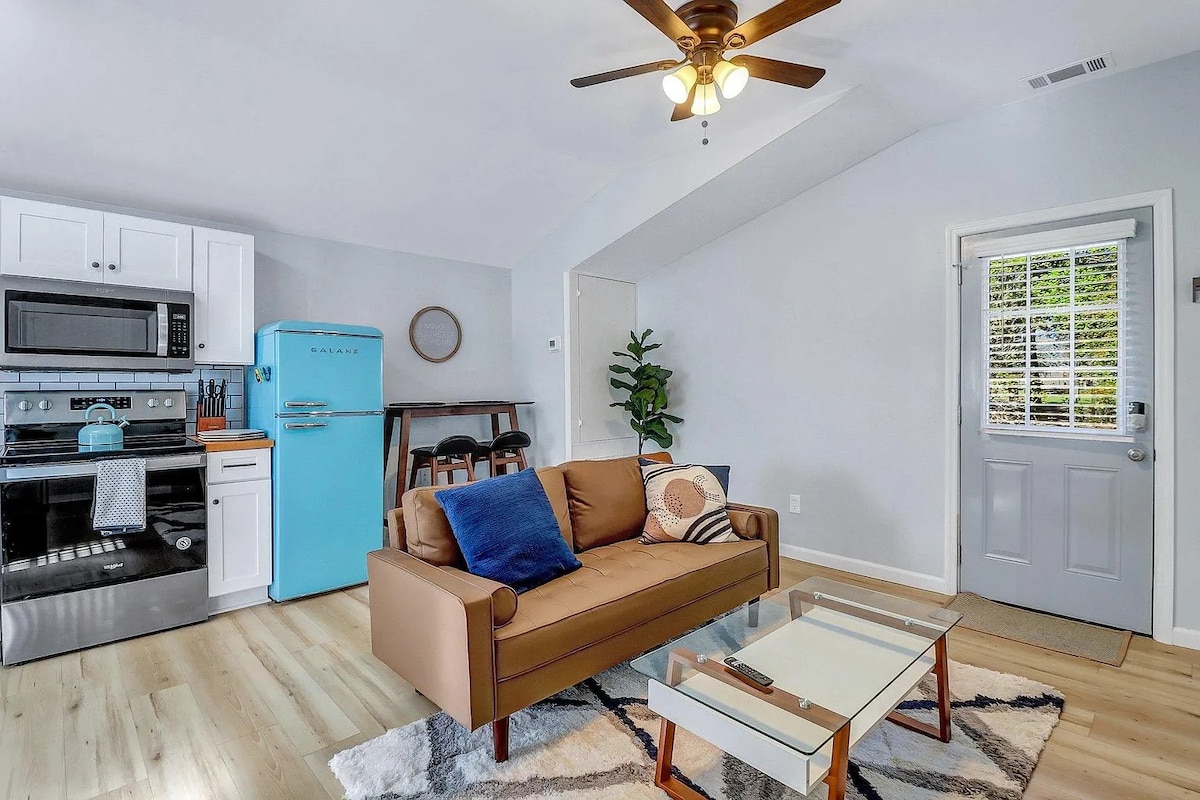 A Savannah történelmi Streetcar District negyedében található The Garden Studio at Half Moon House egy privát menedék a városon belül, amely ötvözi a funky, századközepi modern stílust és rusztikus víkendházi hangulatot. Ebben a nyitott koncepciójú helyiségben van egy teakonyha alapvető kellékekkel, egy extra hosszú, karmos lábú fürdőkád kézi zuhanyzóval, valamint egy békés kertre néző, padlótól a mennyezetig érő ablakokkal. Az 1914-es gyarmati újjáéledési otthon mögötti történelmi kocsiszínben található, mindössze pár percre a Forsyth Parktól, a Starlandtól és a legjobb éttermektől.