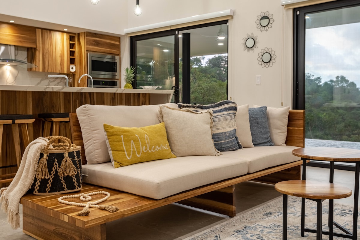 Discover Art Villa, where breathtaking ocean views meet the vibrant rainforest and bold contemporary design. Perched above the jungle, relax in a serene canopy setting surrounded by lush gardens, and savor every moment as the sea peeks through the rainforest below. Disconnect from the city while staying fully connected with our high-speed fiber-optic internet. Just 1 km from the main road and the beach Your ultimate rainforest escape awaits,where every sunrise and sunset is a masterpiece.