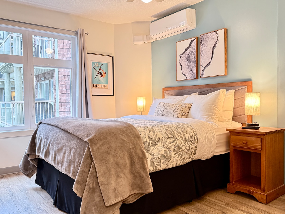 Just 1.1 km from the heart of Canmore. This cozy hotel room includes heated underground parking, high-speed Wi-Fi, and a smart TV with cable for your entertainment. The bedroom features a plush queen bed with a memory foam mattress. Stay cozy year-round with AC for the summer and a floor heating system to warm you after a day of skiing. The kitchenette is equipped with a mini refrigerator, microwave, coffee machine, kettle, wine glasses, and mugs, perfect for light meals and morning coffee.