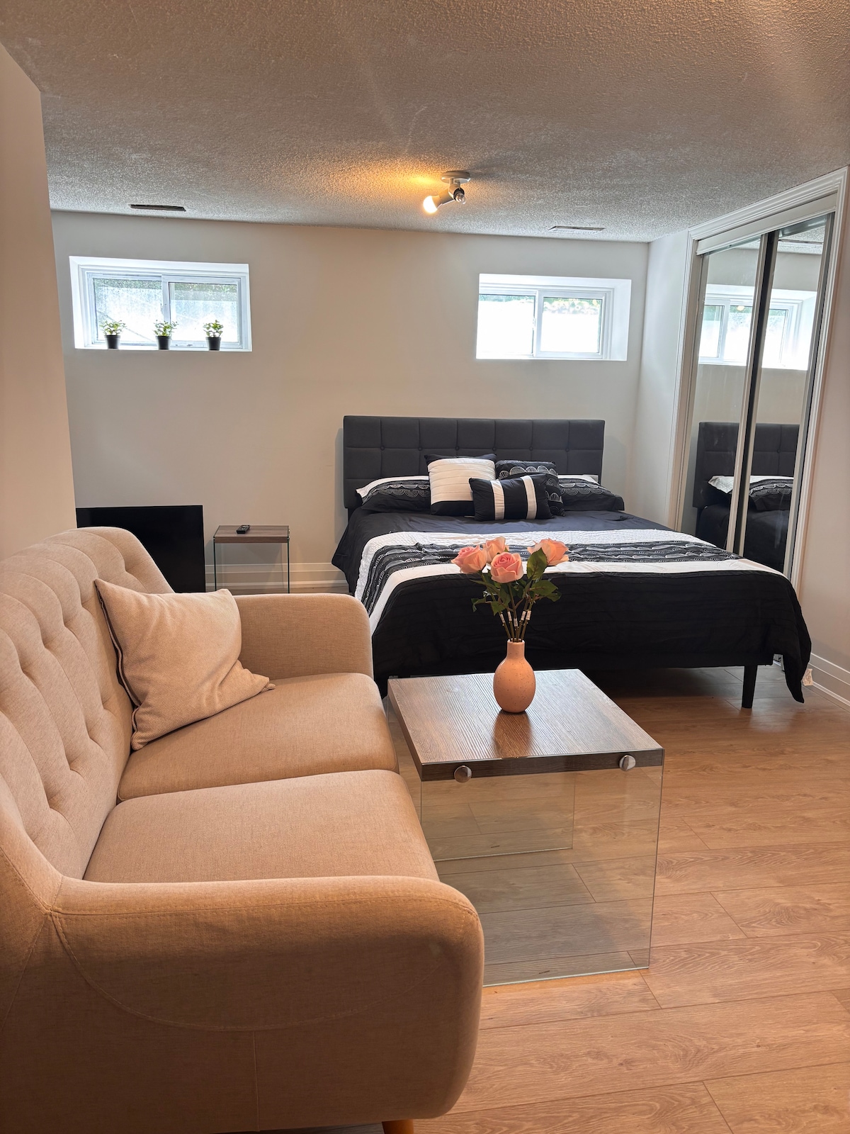 · Escape the busy and relax in this your premium highly privacy little basement apartment. · 1 bed 1 bath, 1 living room, with full laundry and kitchen, refrigerator of course! and they are exclusively for your use! · Comfy environment with queen-size bed, cozy light, and plants decoration, as well as keypad entrance to keep you safe. · Located in a quiet neighborhood. 1 minute to forest park and run field. · Provide 1 covered parking. 3 mins walk to bus stops. 10 mins drive to Highway 401.
