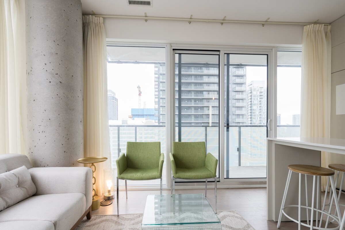 Enjoy jaw-dropping views and comfort in the heart of the action at my sleek, modern and stylish 2 bedroom condo (610 sq feet) in Toronto's Entertainment District. My place is fully equipped with everything you need for a getaway or business trip. It's close to all major tourist sights, trendy shops, and the hottest bars and restaurants. One free private parking space is included. I'm also a highly responsive superhost with over 1,000 reviews.