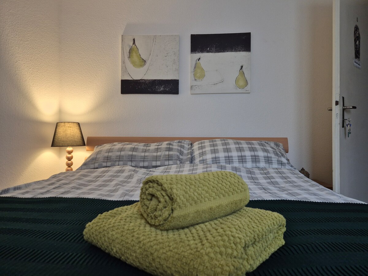 Unsere Gäste verfügen über eine eigene Wohnung, die jedoch immer nur an eine Partie vermietet wird. Sie verfügt über zwei Doppelbetten und ein Einzelbett. Babybett auf Wunsch. Die Wohnung liegt im 2. Stock, erreichbar über Treppen (kein Lift), dafür sehr ruhig und mit toller Aussicht auf Munot, Rhein und Schaffhausen. Die Stadt Schaffhausen ist zu Fuss in 10 Minuten zu erreichen. Parkplatz für Ihr Auto wird Ihnen von uns zur Verfügung gestellt. Grosse Dachterrasse für ungestörtes Sonnen.