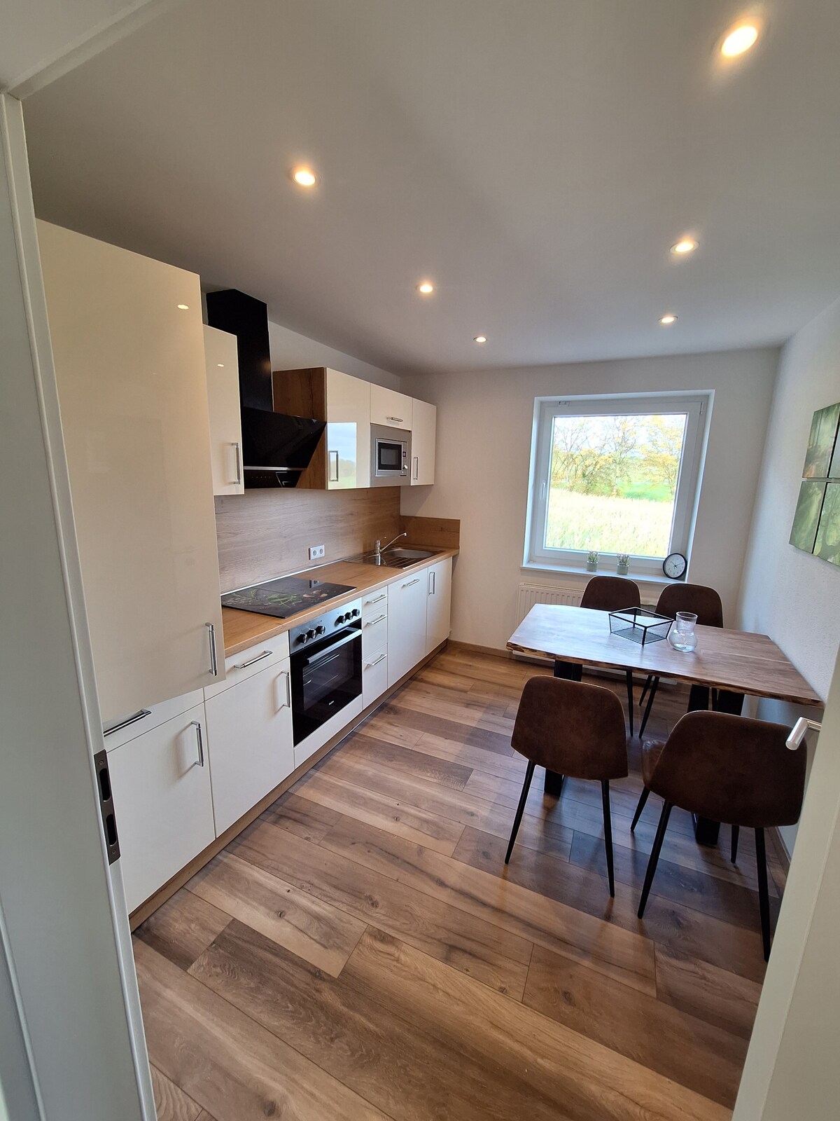 Dies ist unser 2-Zimmer-Appartement, in dem bis zu 5 Personen Platz zum Übernachten haben. Es gibt ein Schlafzimmer mit einem großen Doppelbett, eine Wohn-Ess-Schlafzimmer-Küche mit einem Schlafsofa und einem Schlafsessel, dazu ein hübsches, modernes Bad. GANZ WICHTIG: Bei uns leben viele, viele Tiere auf dem Hof! Bei uns krähen morgens die Hähne, die Enten quaken und die Schweine streiten sich das eine oder andere Mal etwas lauter beim Frühstück... Bitte NUR buchen, wenn ihr das akzeptiert.