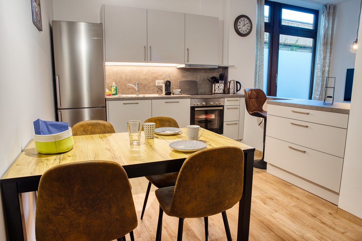 Hangulatos duplex lakás (kb. 55 m2) miniház stílusban Amberg szívében. A műemlékházban található hangulatos apartman saját bejárattal, valamint zuhanyzóval és káddal felszerelt fürdőszobával rendelkezik. Teljesen felszerelt konyha mosogatógéppel és mosógéppel, nappali íróasztallal, beépített szekrényekkel, rengeteg tárolóhellyel és egy hangulatos ággyal. Ezenkívül a kanapét kanapéággyá alakíthatod (180x200), amelyen további két ember fér el.