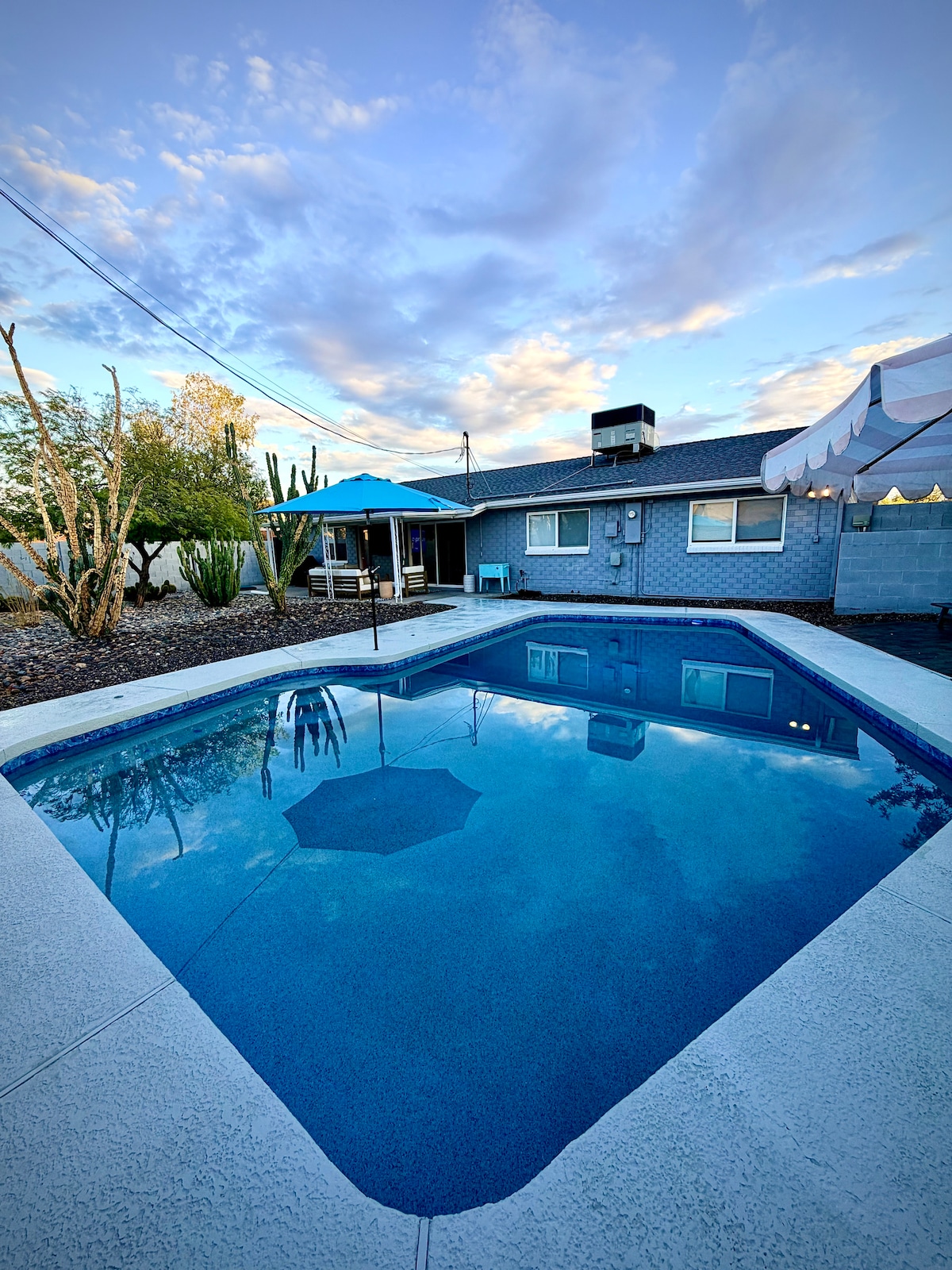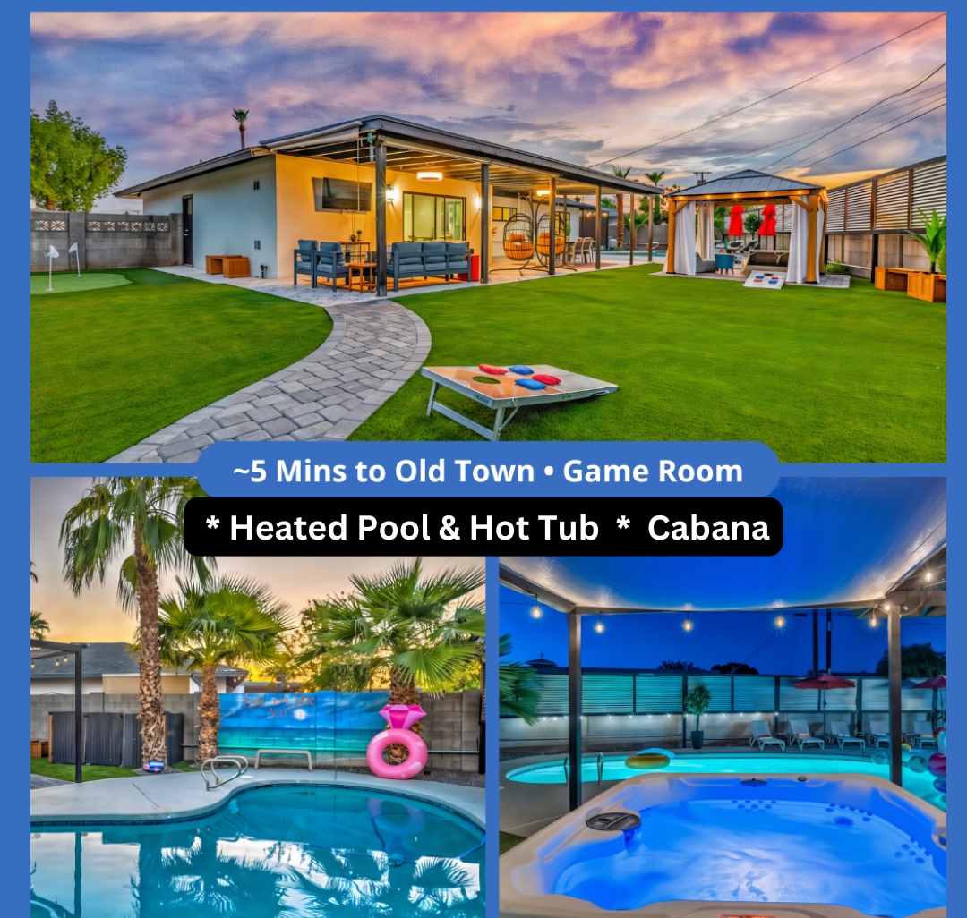 A Revolution Retreat vadonatúj, fűtött medencével, travertin csempével és gyep hátsó udvarral rendelkezik. Az otthont nyitott alaprajzzal és egyedi stílussal tervezték, tökéletes helyet teremtve a nyaralásodhoz. Scottsdale óvárosától 3 mérföldre, a repülőtértől pedig 15 percre található, így a völgyek főbb látnivalói kellős közepén találod magad. Az otthonban akár 10 vendég is kényelmesen elfér. (Vedd figyelembe, hogy a medence díj ellenében fűthető, az alábbi részletekért)