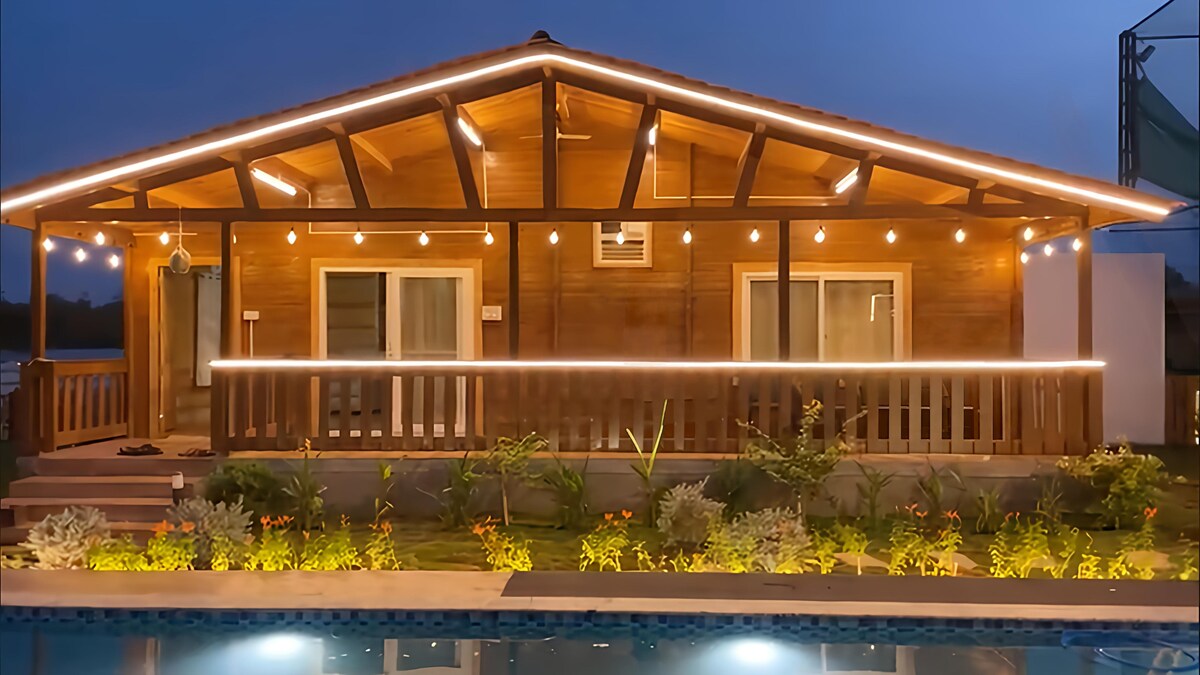 Üdvözlünk egy békés pihenőhelyen, amelyet a tökéletes kikapcsolódásra terveztek. Dőlj hátra, és lazíts ebben a nyugodt, stílusos helyen, amelyet úgy rendeztünk be, hogy tökéletes menedéket nyújtson a mindennapi rohanás elől. Az ingatlan egy tágas, teljesen berendezett 3 BHK (hálószoba, előszoba, konyha), amely bőséges helyet kínál családoknak vagy baráti társaságoknak. A szálláshely egyik fénypontja a 7,3 × 3,7 × 1,4 méteres privát medence. Ez a jelentős méret tökéletes egy frissítő fürdőzéshez, egy kényelmes elmerüléshez vagy néhány vidám medencejátékhoz.