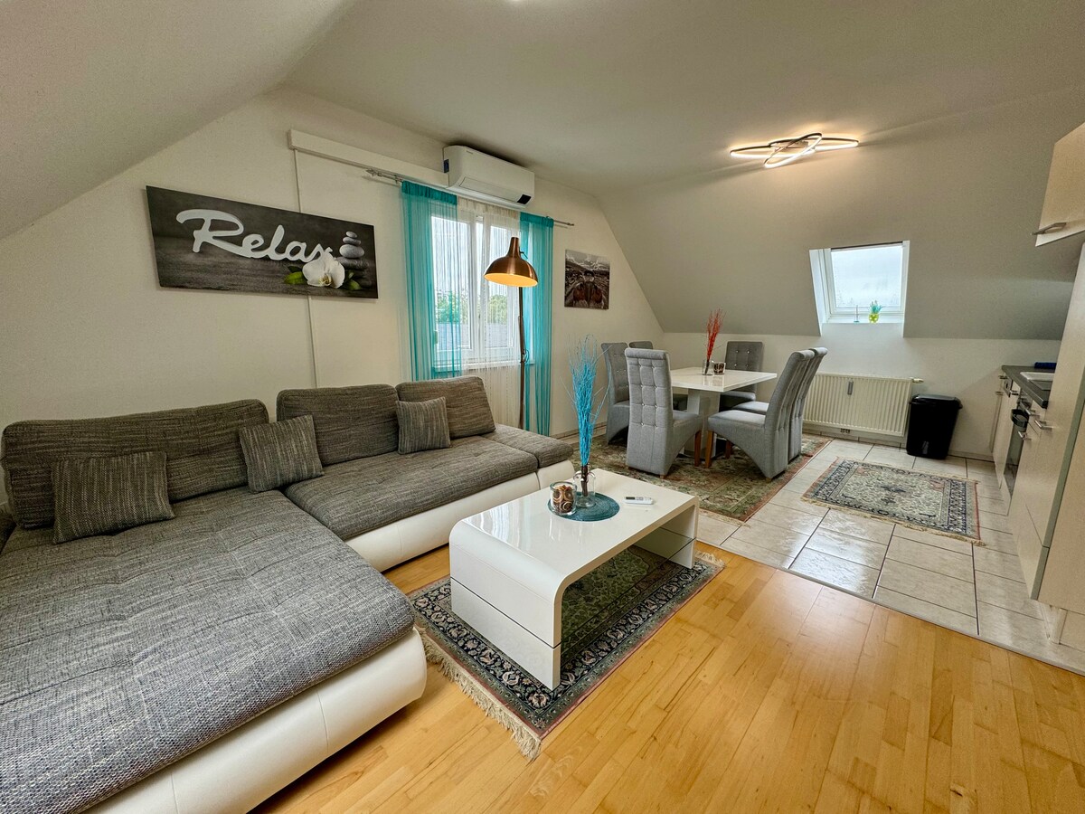Ruhige Lage , sehr Helle , sonnige Wohnung mit Ausblick in die Natur ! Optimal für einen Gast oder für 2 Gäste gerne mit 1 - 2 Kindern . Parkplatz am Straßenrand oder nach Absprache vor der Garageneinfahrt. Autobahn Anbindung ganz nah . Straßenbahn/Bus und Taxistand in 2 Gehminuten erreichbar mit denen man innerhalb 10 Minuten ins Zentrum fährt .Supermarkt ,Restaurant ,Kino ,Mc Donalds , Pub, Konditorei, Kinder Erlebniswelt, in der Nähe zu Fuß erreichbar , Flughafen und Bahnhof 10 Minuten.