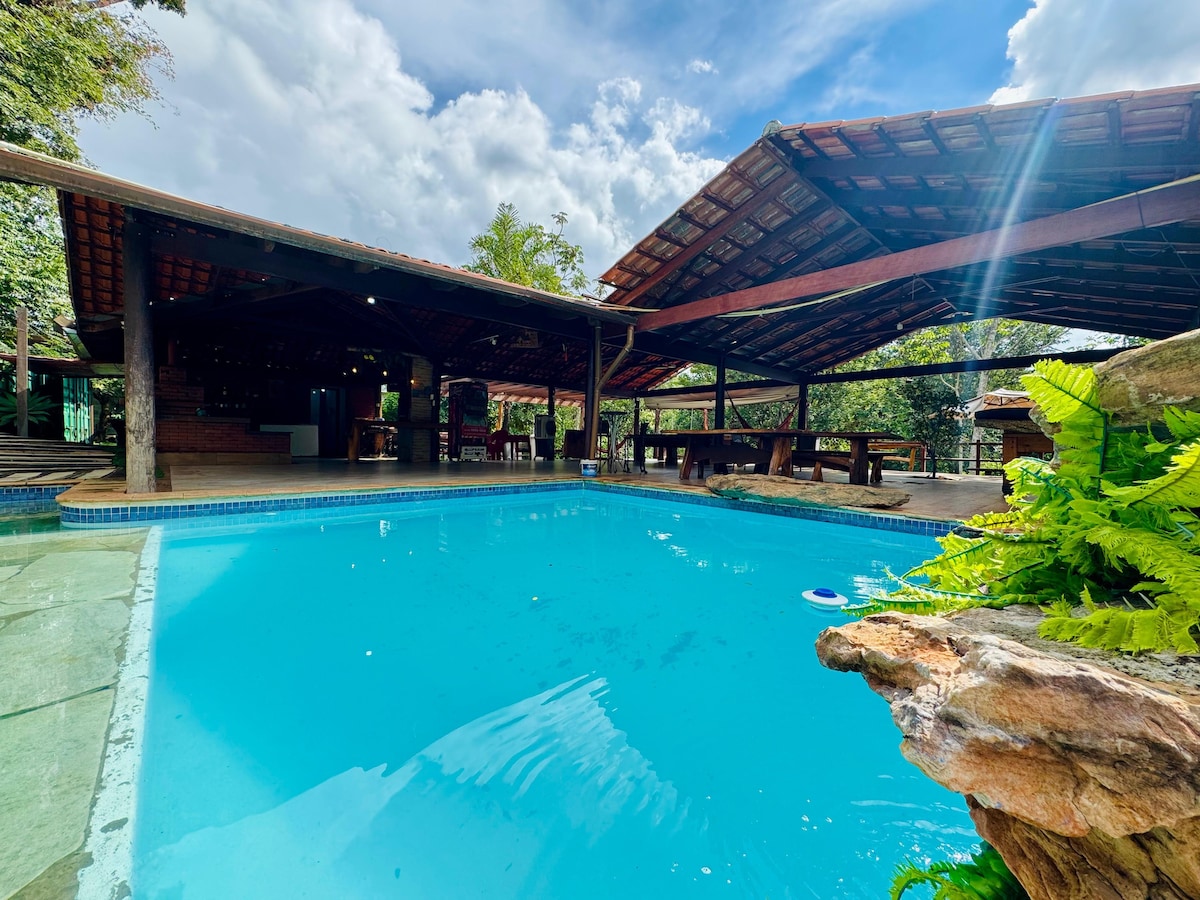 Családi hely, úszómedencével, bárpulttal és focipályával. Hangulatos a rusztikus dekorációjának és a gyönyörű természetes fénynek köszönhetően. Senador Canedo városa közelében, 12 percre a goiânia-i Flamboyant bevásárlóközponttól. A HÁZIGAZDA HÁZA 150 MÉTERRE VAN A HELYSZÍNTŐL. HA KUTYÁT HOZ, TARTSA PÓRÁZON, HOGY NE TÁMADJA MEG A TERÜLETEN TARTÓZKODÓ MADARAKAT. WIFI ELÉRHETŐ. NEM BIZTOSÍTUNK ÁGYNEMŰT. A 2 ÉVESNÉL IDŐSEBB GYERMEKEK NORMÁL ESETBEN FIZETNEK. A LÁTOGATÓK 70 R$ DÍJAT FIZETNEK, ÜNNEPNAPOKON 80,00 R$-T.