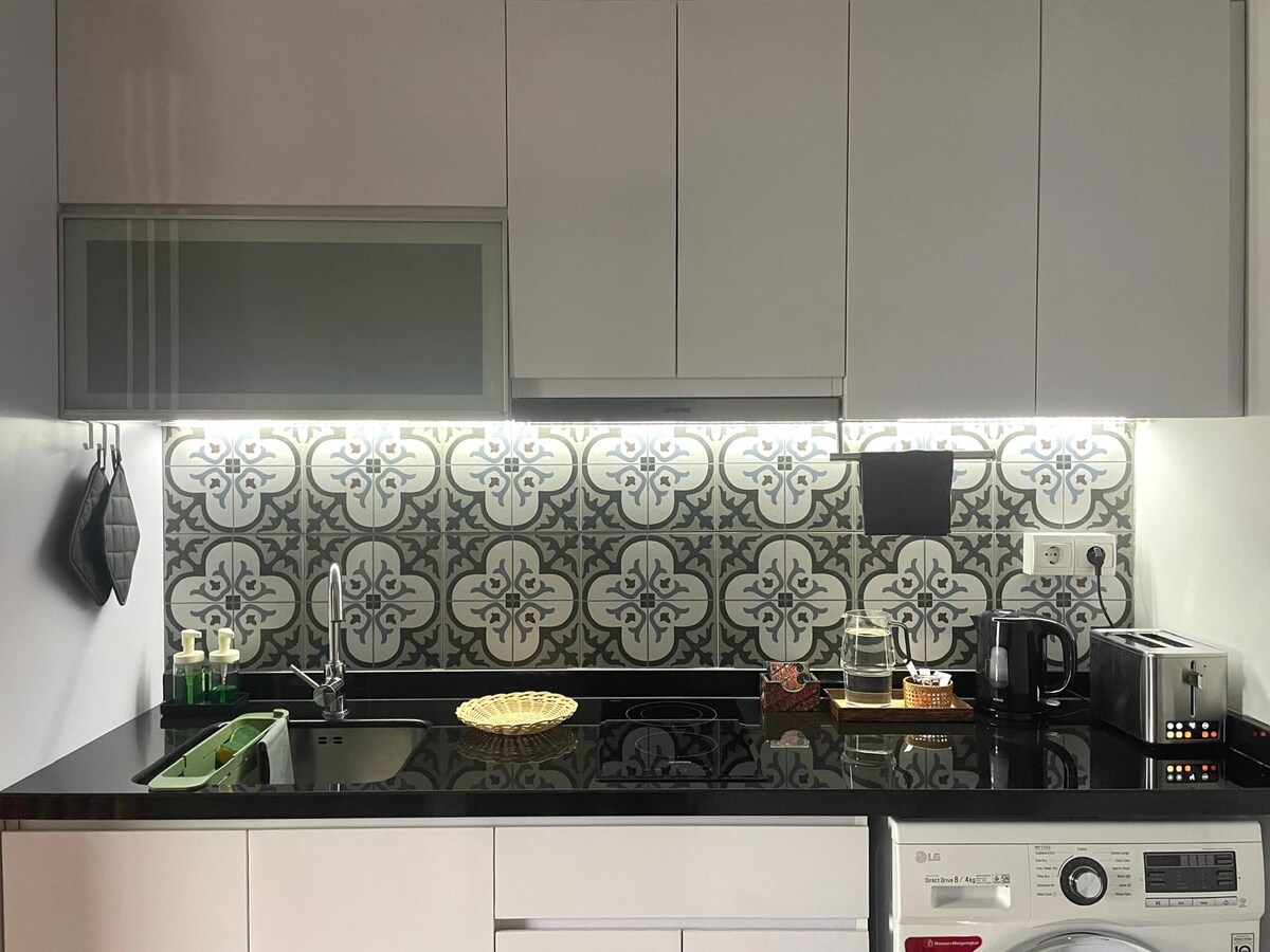 An elegant 24sqm studio in Jakarta's center, blending style and convenience. Includes kitchen, fast Wi-Fi, air-purification, 43" smart TV, sound system and Netflix. It is ideal for various stay types, with contactless access and amenities like pools, jacuzzi, gym, and basketball, Now features a Reverse Osmosis dispenser & food waste disposal, The picture shows a gas stove that has been replaced by an induction cooker (to follow the apartment guidelines for fire hazards)