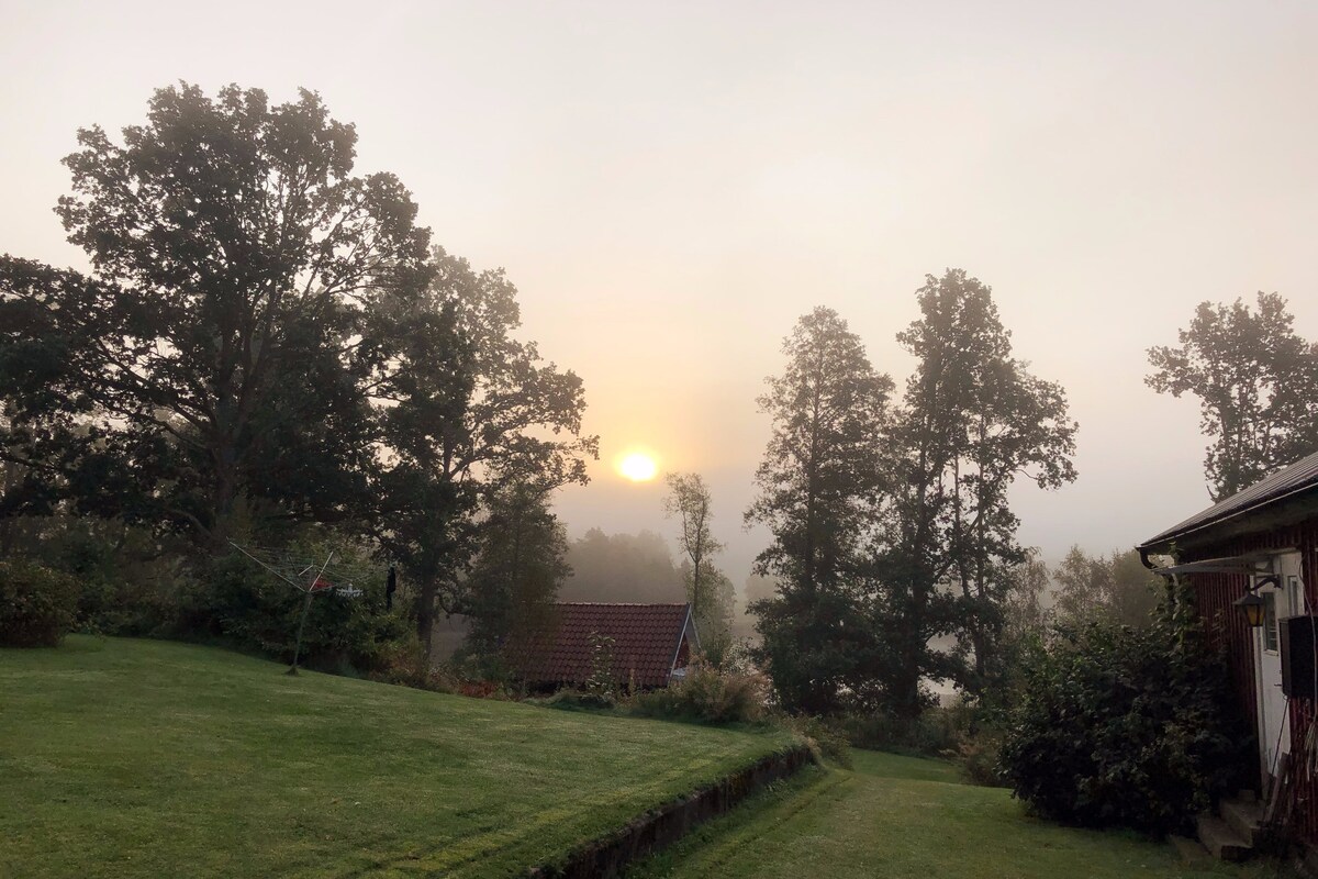 Lazíts ezen az egyedi és nyugodt helyen. Itt egy hangulatos házban élsz a farmunkon, a kilátás lenyűgöző, és nem lehetetlen látni a mezőn legelésző dámszarvast és jávorszarvast. Hátul van egy nagy terasz, ahol láthatod a napfelkeltét. Horgászható tavak (halászati engedély szükséges) és erdő közelsége, 9 km-re Halmstad központjától és 7 km-re Hallarnától, ahol éttermek is találhatók. Ha a tengerhez szeretnél eljutni, 15 perces autóútra számos szép strand található. A reggelit előző este lehet lefoglalni.