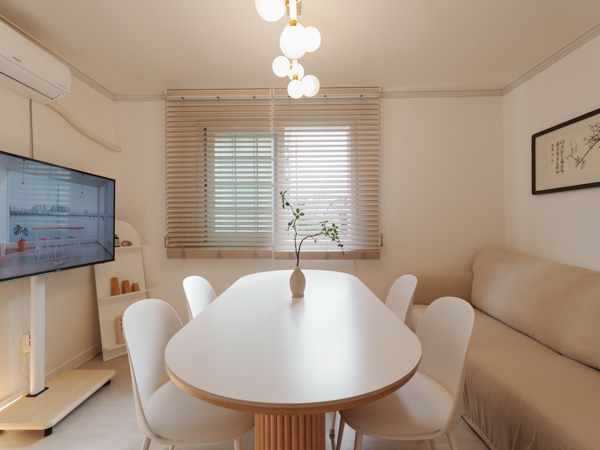 Welcome to our design house, created by a former architecture student from Samsung Engineering & Construction and a Qartar Airways flight attendant! This model-like house is furnished with stylish, new furniture, perfect for a fresh start. Marshall, Bose speakers and considering hosting a wine party for up to six people—it's an ideal setting for a newlywed couple! Super-sized projector where you can watch the latest films. Fantastic photo spot, filled with beautiful decor and charming props.