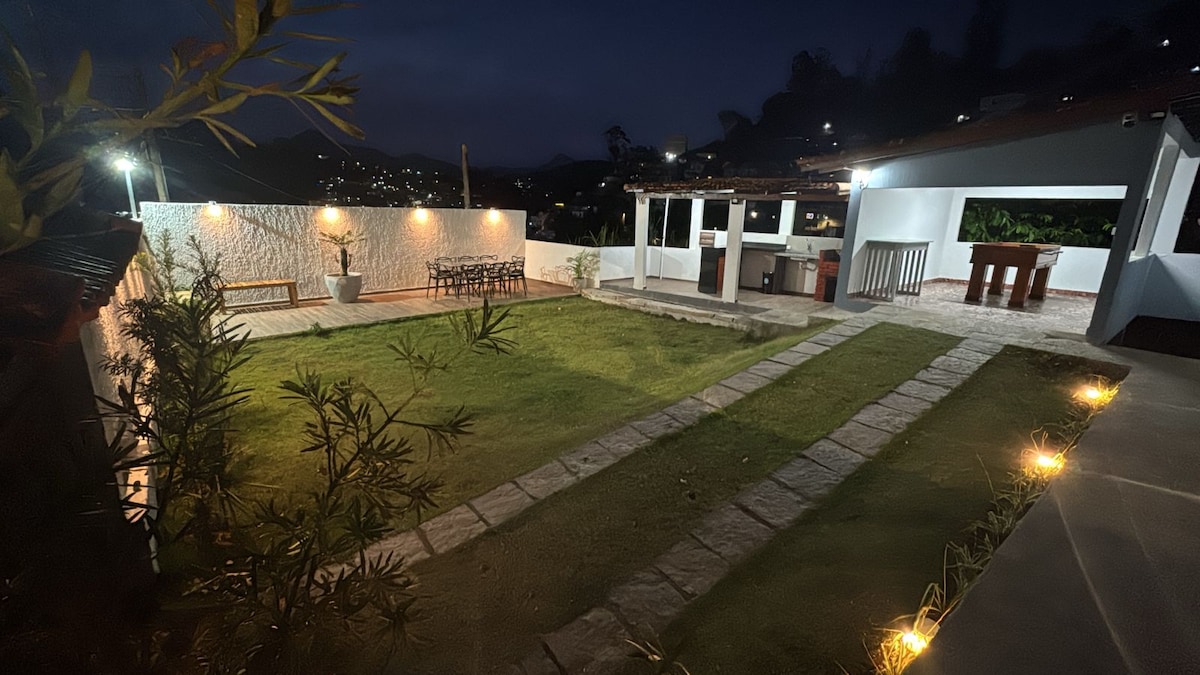 400 m2-es ház Guarita által ellenőrzött hozzáféréssel, a Teresópolis hegyvidéki régió által nyújtott nyugalommal és számos szabadidős tevékenységgel az ingatlanon és azon kívül Medence, grillező, pizzasütő, kártyaasztal és társasjátékok, biliárdasztal és képernyő, ahol különböző közvetítésekben nézhetsz filmeket, és megnézheted a kedvenc sportjátékodat. Tévék a ház és a nappali 5 lakosztályában. Túrák és vízesések a nemzeti parkokon belül és kívül.
