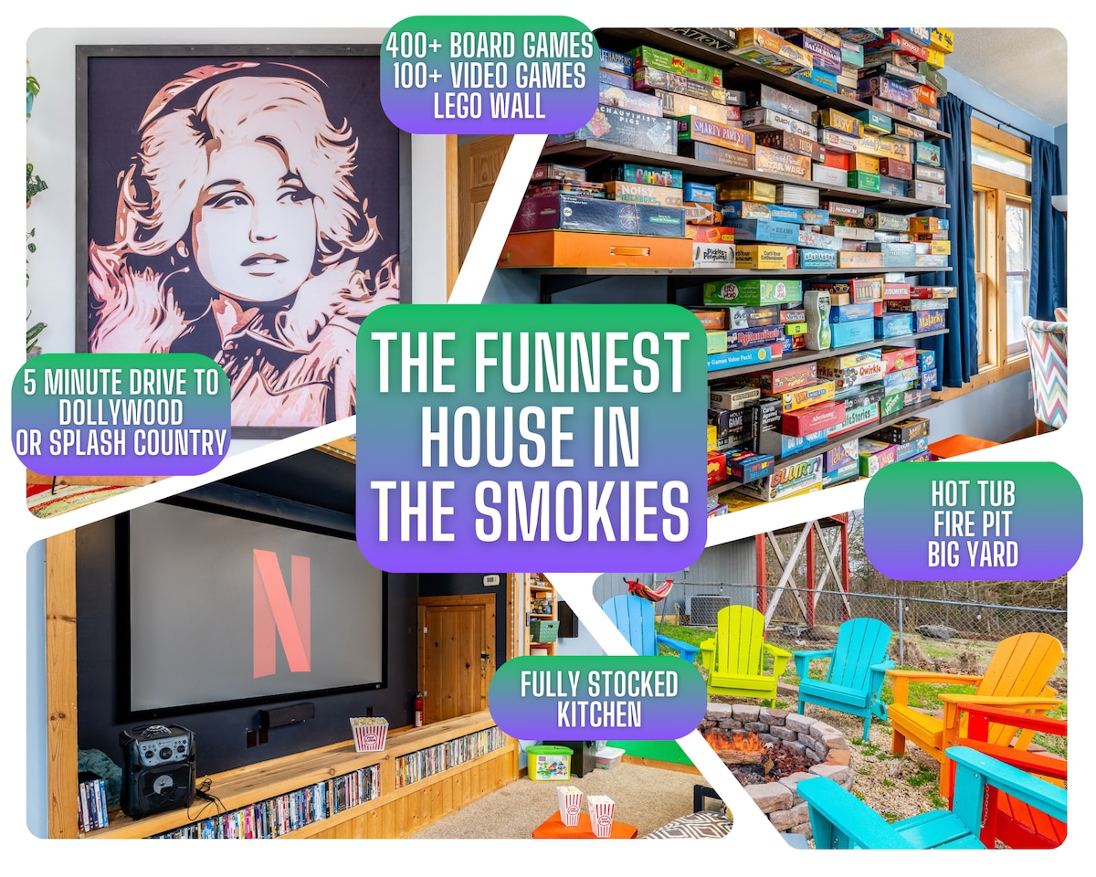 A karácsonyi dekorációk januárig láthatók! Élvezd a HATALMAS pezsgőfürdőt, a térhatású hangrendszerrel felszerelt projektorvásznat, a 4 méter hosszú Lego-falat, a több mint 500 társasjátékot, a több mint 100 videojátékot, a csocsóasztalt, a nagy udvart, a tűzrakóhelyet és még sok mást! Kényelmes ágyak, KÉT nappali, luxus kávézó és a környék LEGJOBBAN FELSZERELT konyhája! Nincs még egy ilyen hely! 5 percre van Dollywood és Pigeon Forge, könnyen megközelíthető Gatlinburg, de nincsenek meredek, őrült utak!
