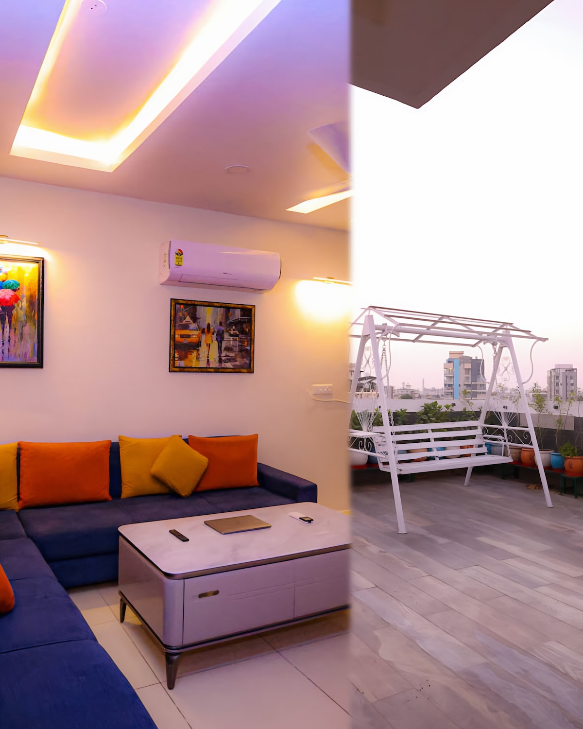 Welcome to your luxury urban retreat – a fully furnished 3-bedroom apartment on the 5th floor with a balcony Jacuzzi & sweeping city views. Perfect for families, Couples, business travellers, or small groups seeking both style and convenience. 📍 Prime Location • Situated on Main Tonk Road, one of Jaipur’s key arteries • 1 minute from Gandhinagar Railway Station • 10 minutes from Jaipur International Airport • Close to shopping hubs, cafés and local attractions