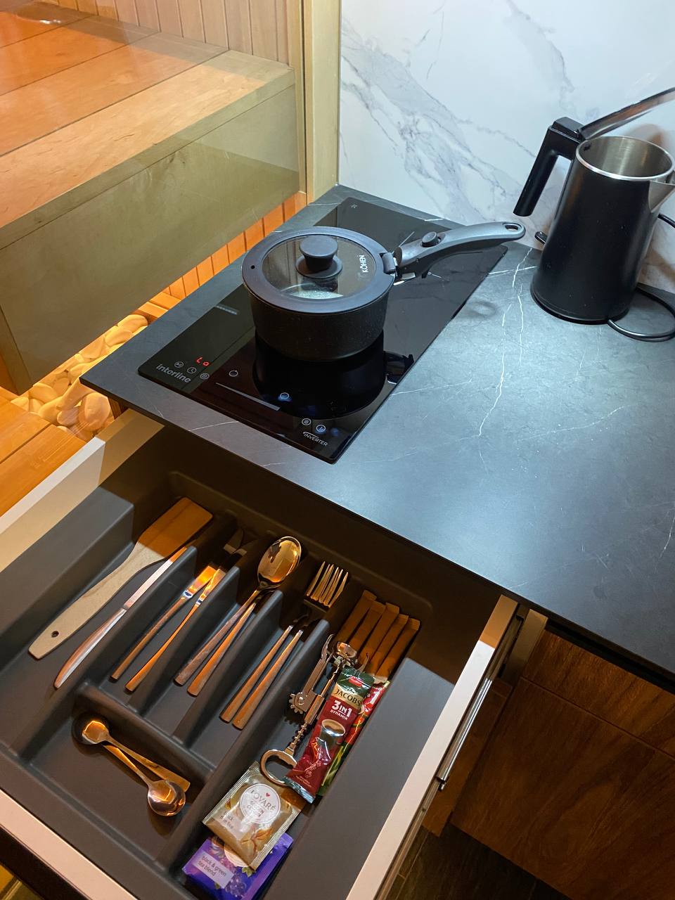Stylish SPA suite in the heart of Kyiv, on Andriivskyi Descent. Panoramic windows with a view of the city, a spacious jacuzzi right in the room and a private sauna create an atmosphere of complete relaxation. Ideal for a romantic holiday, celebrations or special moments. A large bed, a modern interior and a kitchenette with everything you need for a comfortable stay. It's more than a number – it's an experience.
